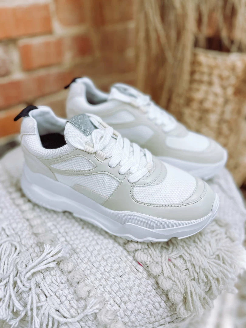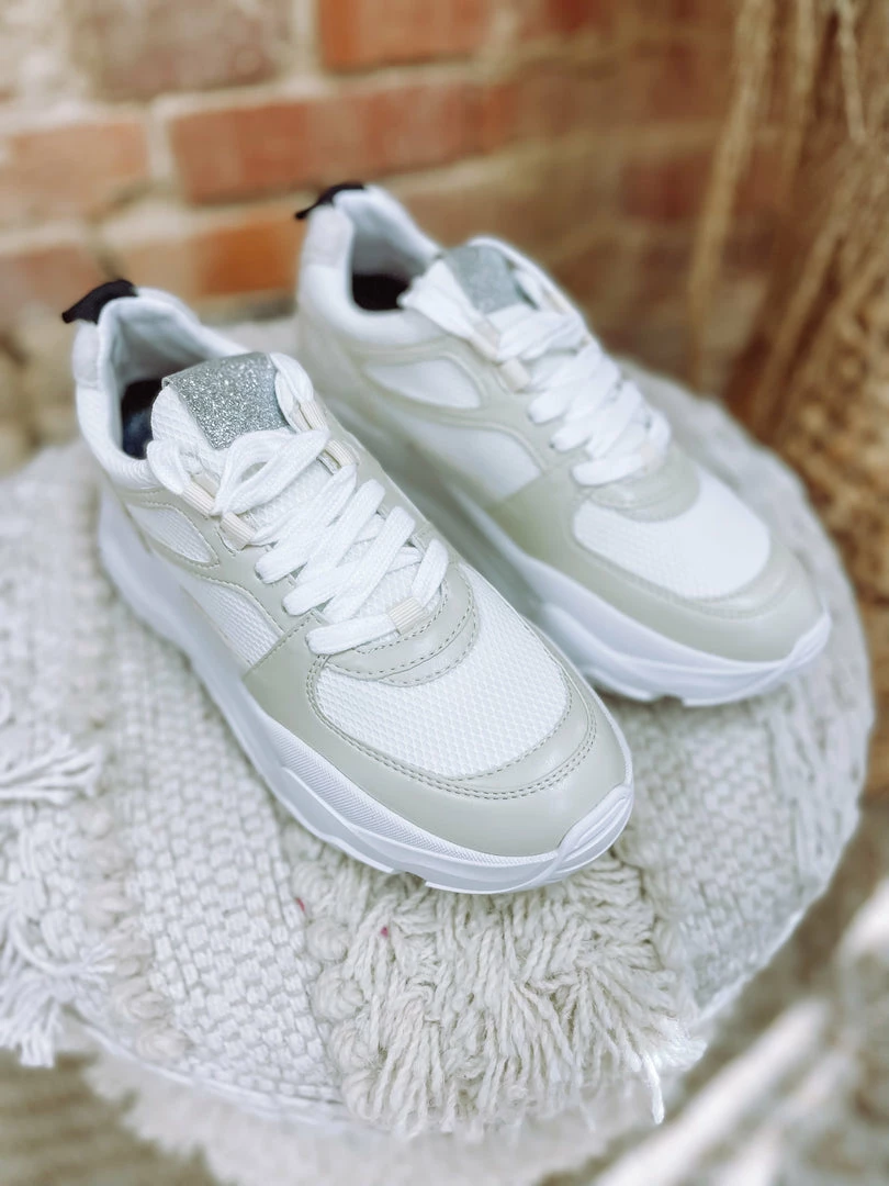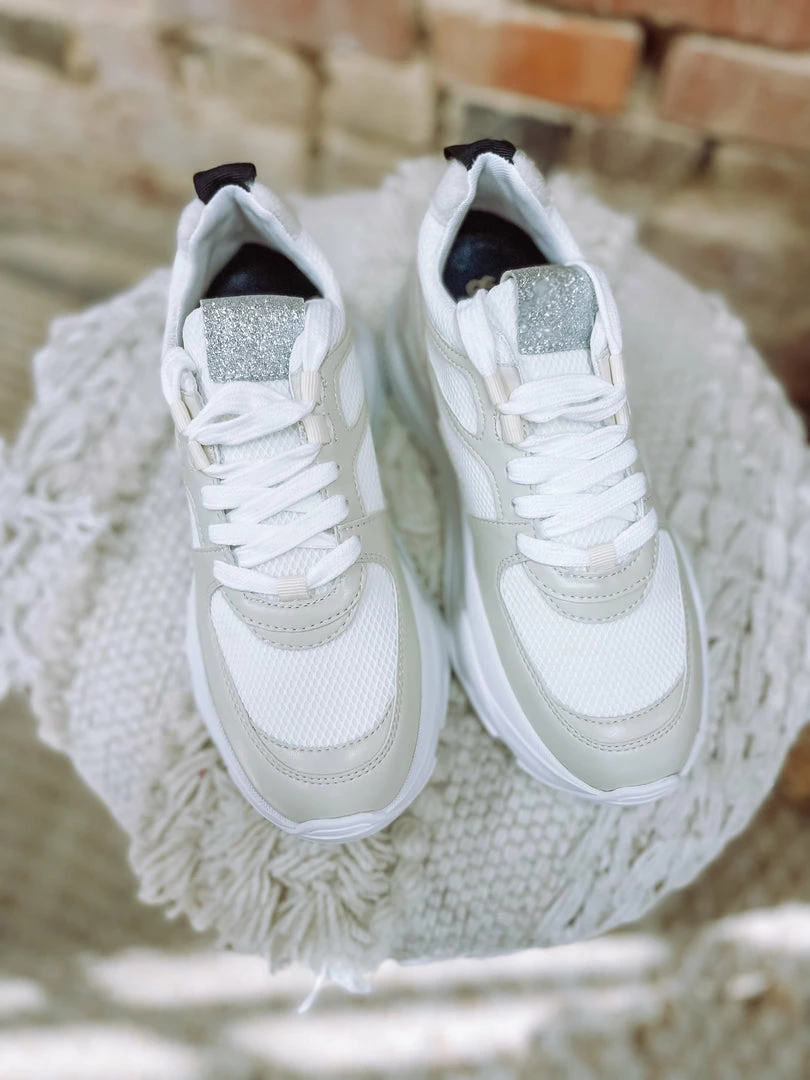 Stride in style with our Evie Sneakers! Crips white kicks with a sparkly texture detailing throughout! The perfect sneakers for back to school and every day wear! Ultimate comfort is provided with a padded sole. Step up and stand out with these must have sneakers!