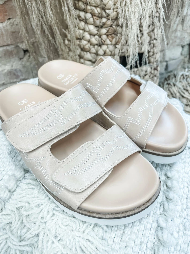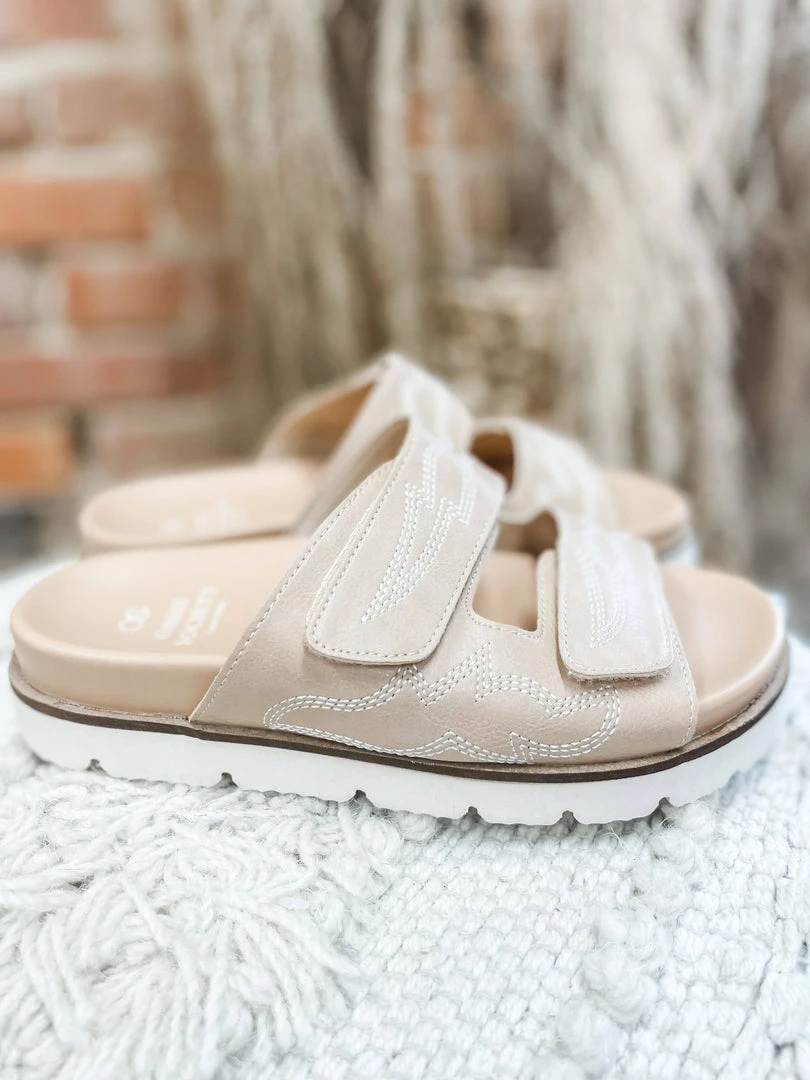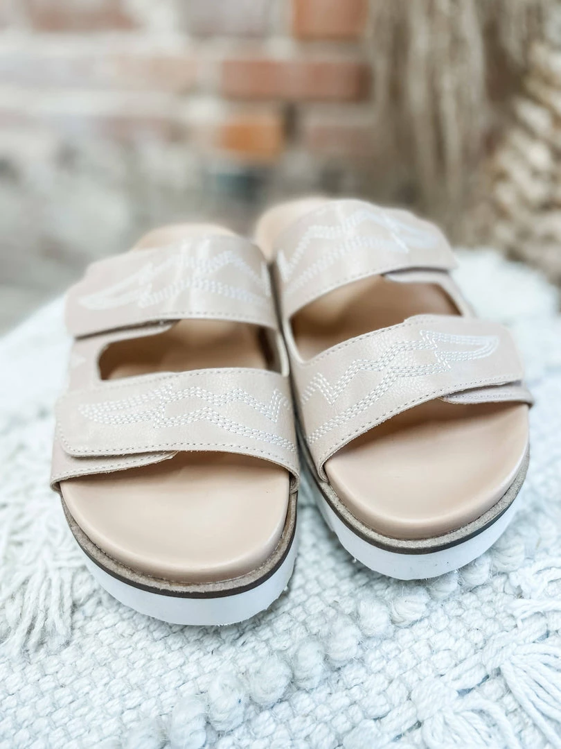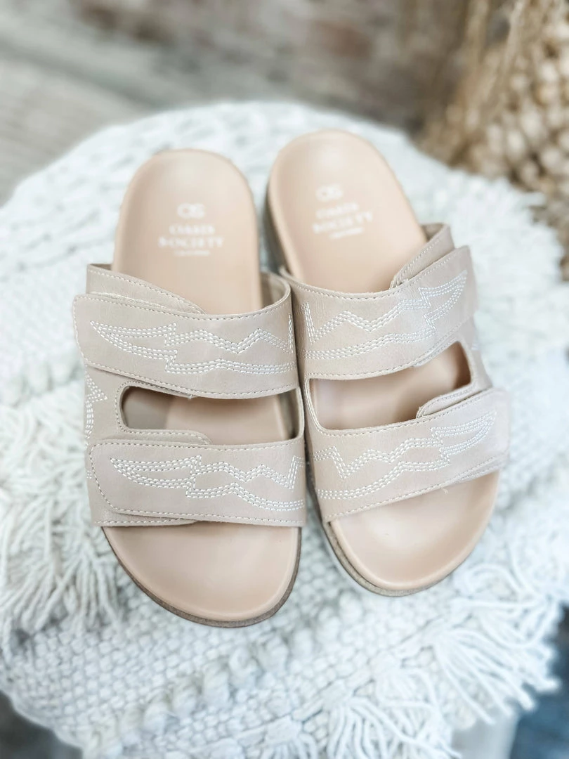 Step into summer in our Layla Sandals!!! Designed with a perfect embroidery detail + adjustable velcro straps. These cuties are the comfiest slide-on sandals ever! They pair well with graphic t-shirts, bathing suits, or any casual outfit you have!