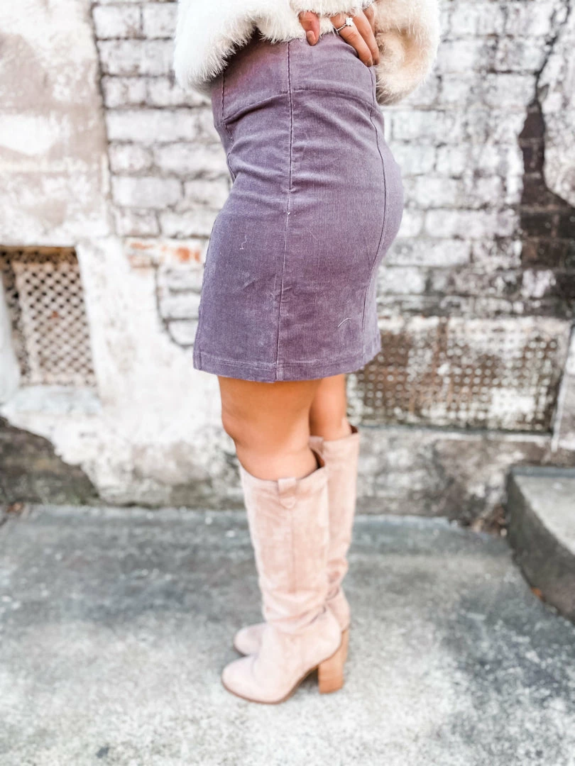 The Nickie Corduroy Mini Skirt brings a beautiful shade of purple and corduroy! Tailored as high waisted with a side zipper and slit detailing on the front hem! Simply perfect for a girls day out on the town! Styled with our Saint Tall Boots and Marley Fuzzy Knit Sweater.