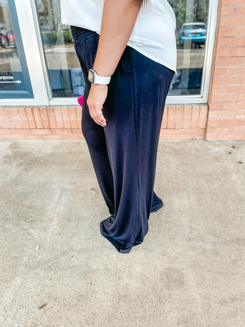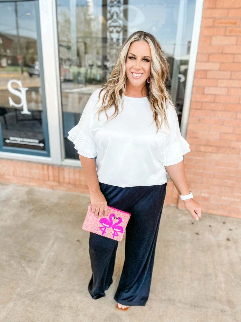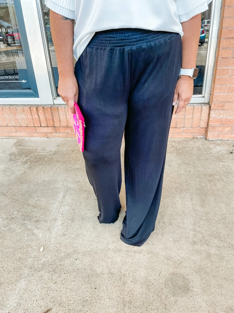 Meet our Sophie Smocked Waist Pants! They arrived just in time for all your new sophisticated looks! Tailored with a wide leg fit + 2 pockets + smocking on the waistband! The comfort + breeziness of these pants make them so easy to pair and style your way! Perfectly paired with our Greta Top and Tropical Leaf Beaded Wristlet.