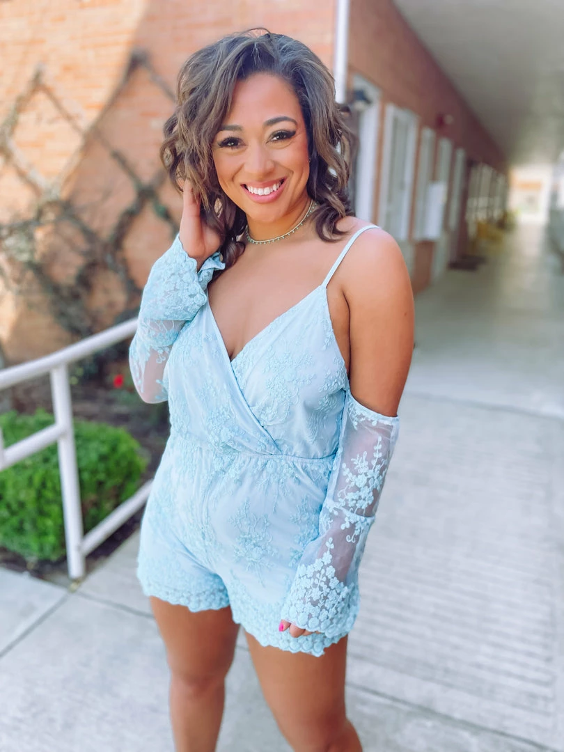 Inhale Fashion, Exhale Style ! This is romper is romance & pure beauty! Tailored with a v neckline + adjustable straps + sheer sleeves + elastic waistband! Finishing in the most stunning shade of turquoise! Be girls trip ready with this sweet piece! Styled with our Clara Clear Heel Pumps.