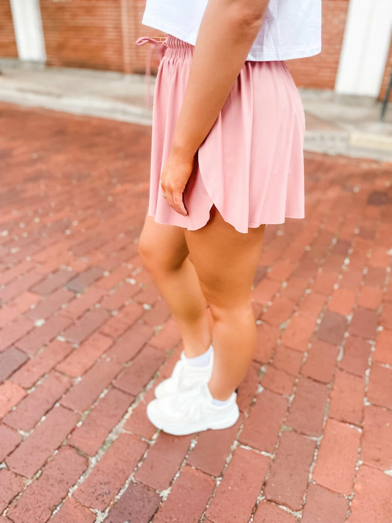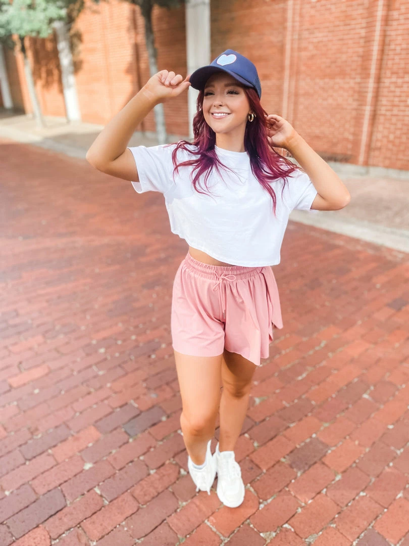 Chic breathable shorts have arrived in full fashion forward style thanks to these stellar bottoms! Tailored as high waisted + elastic waistband with a functional drawstring! Tailored with shorts as a lining and skort like appearance, these shorts IT ladies! Pair with all your favorite work out tops and graphic tees!! Styled with our Eva Cropped Tee + Evie Sneakers + the Heart Foam Trucker Hat.