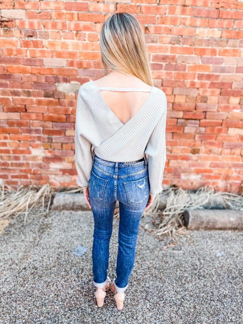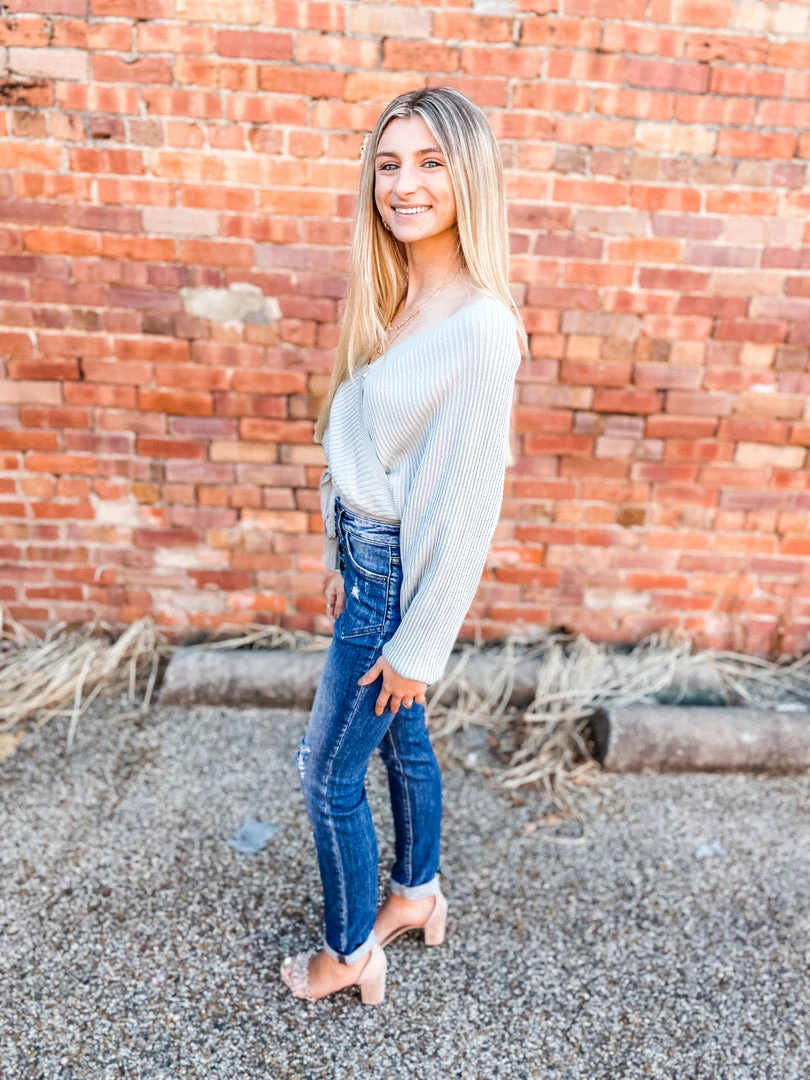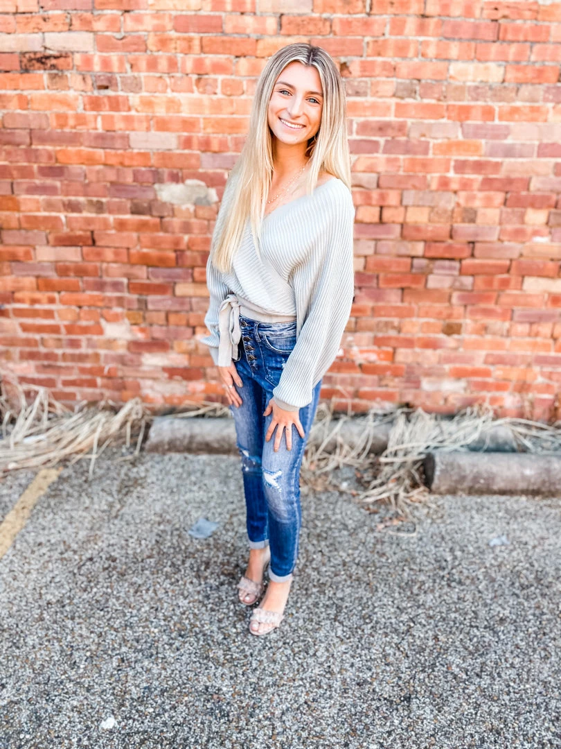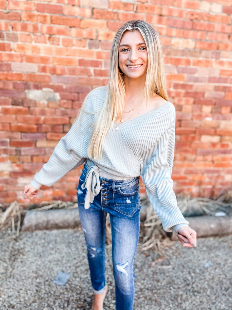 The Hansel Tie Front Wrap Sweater is effortless glam! Designed with a layered v neckline that is mirrored on the back + peplum fit + functional front tie detail! The fabrication is down right perfection for a comfortable fit! We love it for fall nights, but also dolled up with pumps and jewelry for fancy date night, and more! Styled with our Jami High Rise Button Fly Roll Up Skinny Jeans.