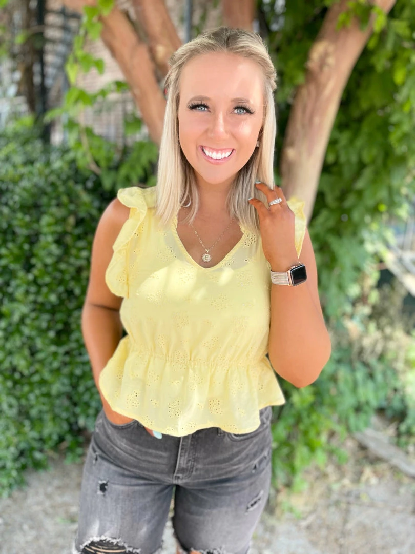 Our Lisa Top is nothing less than a dream! Featuring a v neckline, peplum fit, elastic waistband & flutter eyelet sleeves! Dainty touches that make this top great for work, vacay, and a shopping day! Styled with our Berkley High Rise Mid Thigh Shorts and Efron Sandals.
