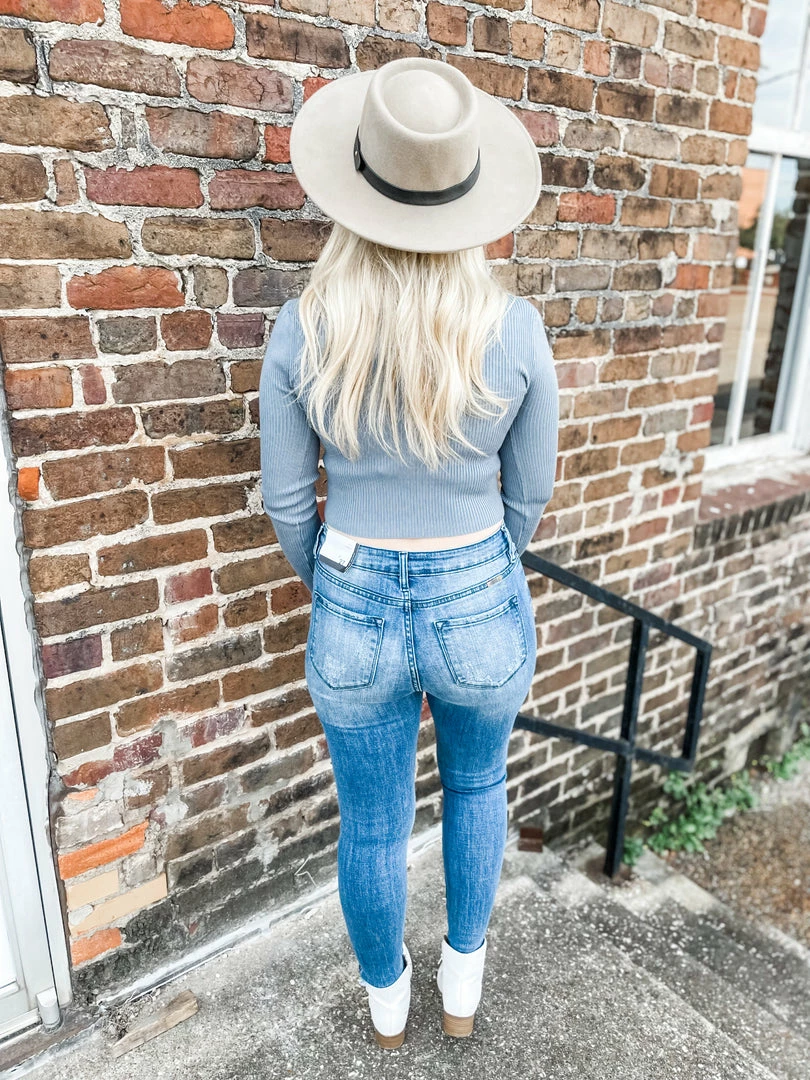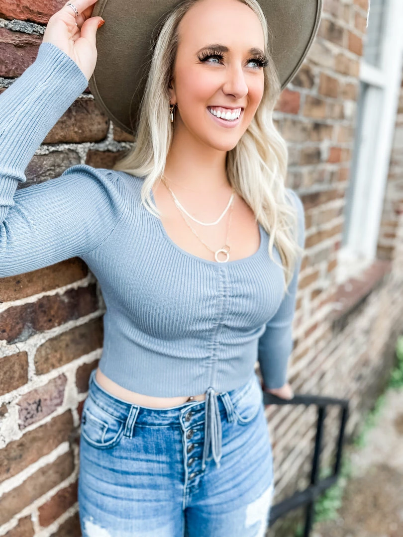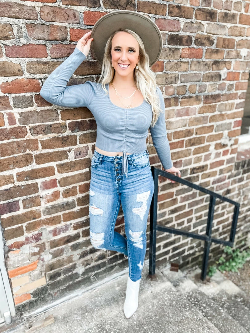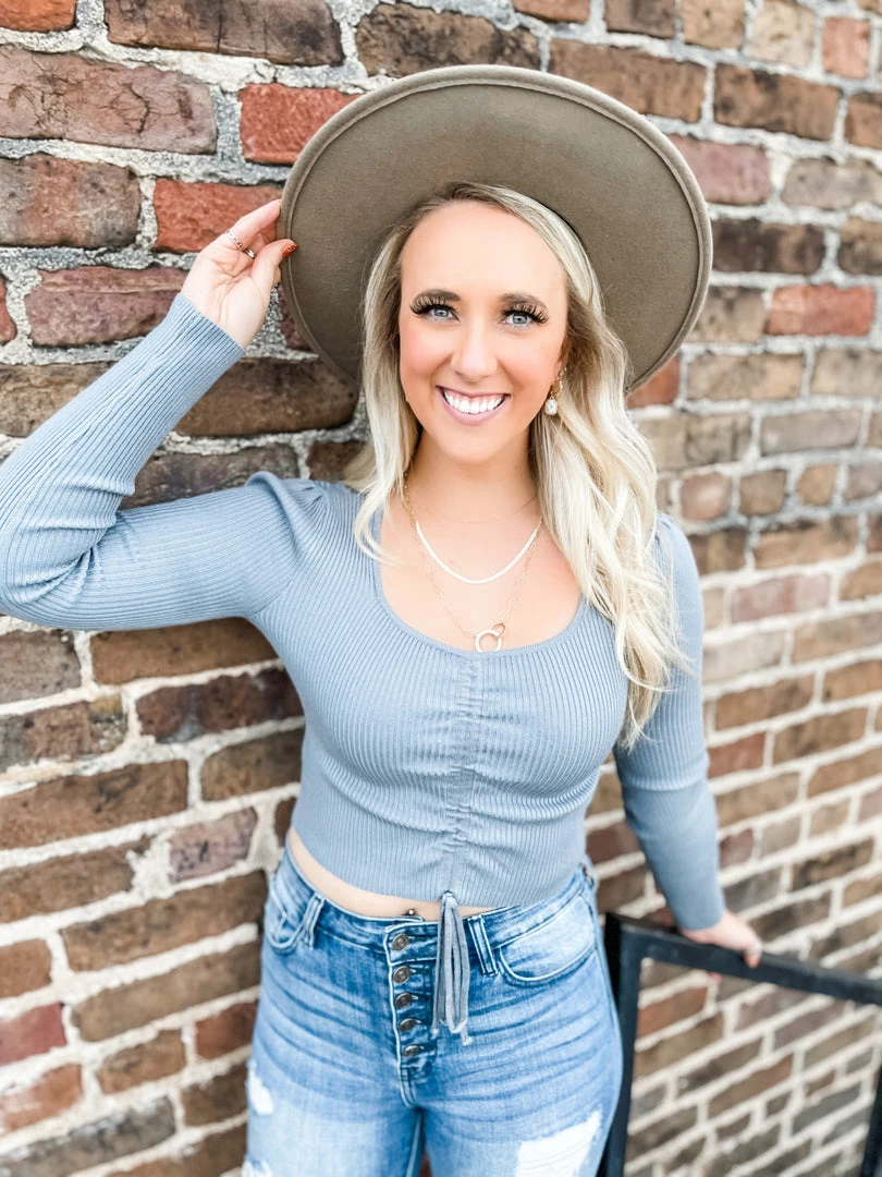 No doubt you’ll look and feel amazing in our Zoe Tie Front Top! Tailored with a soft v neckline that leads to a ruching center detail with a functional tie + midi crop fit + long sleeves + ribbed textured fabrication! This dressy item will instantly have you ready for date night and family parties! Perfectly paired with our Leia Wide Brim Felt Hat, Norway Booties and Annalee High Rise Button Down Skinny Jeans.
