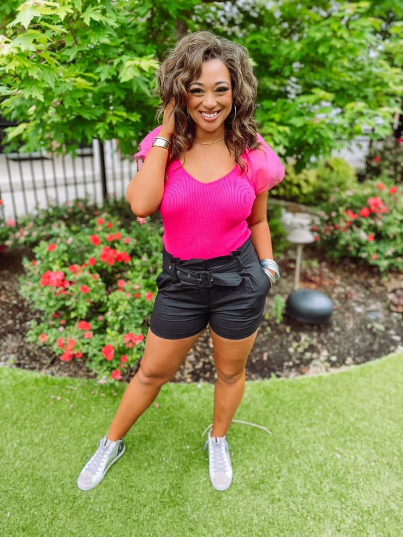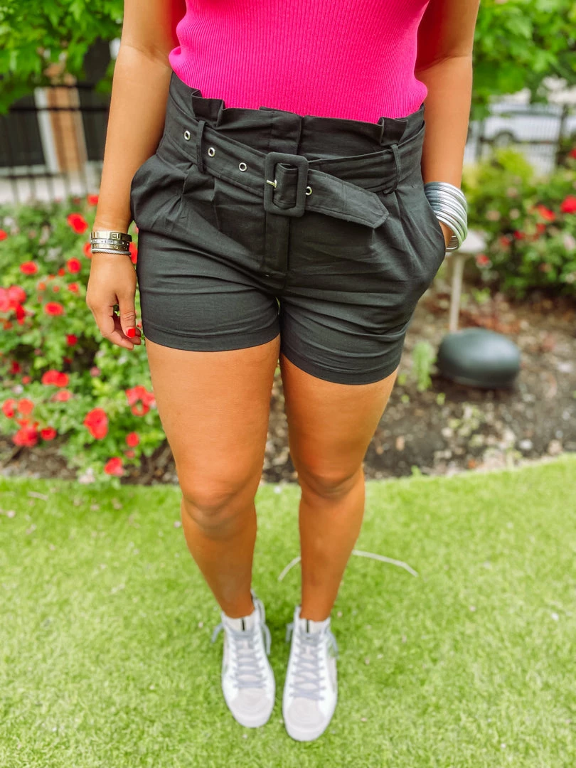 These paperbag shorts are on fire & we are here for it! Our Victoria Shorts are the cutest shorts EVER! They pair so well with tops & bodysuits. Complete the look with your favorite sandals or sneakers for the perfect summer fit! Tailored with a pleated waist band + functional belt + 2 pockets! Styled with our Mallory Sheer Puff Sleeve Ribbed Top and Passion Star Sneakers.