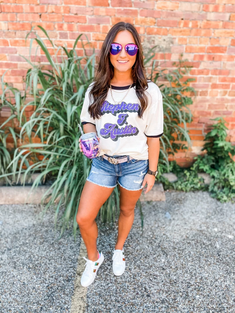 Everyone loves a throw back! You need this >Old School SFA< tee.. Who doesn’t love representing our favorite college “Stephen F Austin” ?!?! The Old School SFA Tee features a cream base with a front graphic. Designed with a Next Level ringer tee which is every college kid’s favorite!