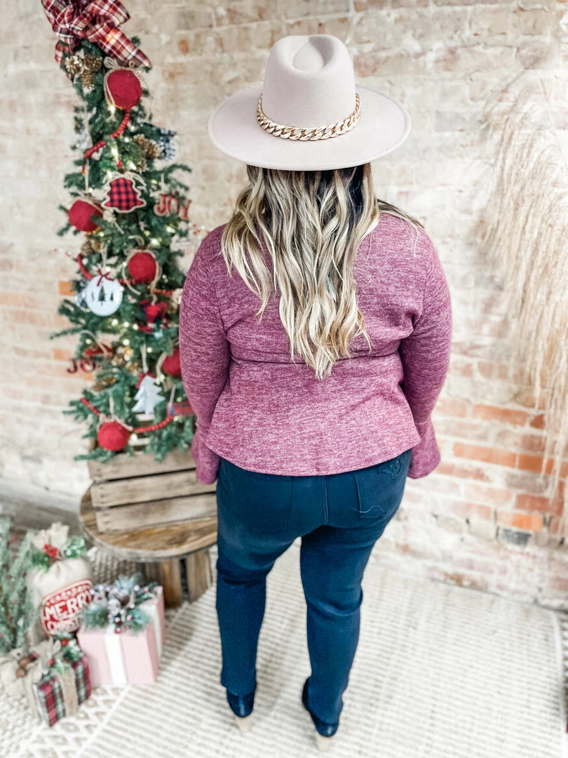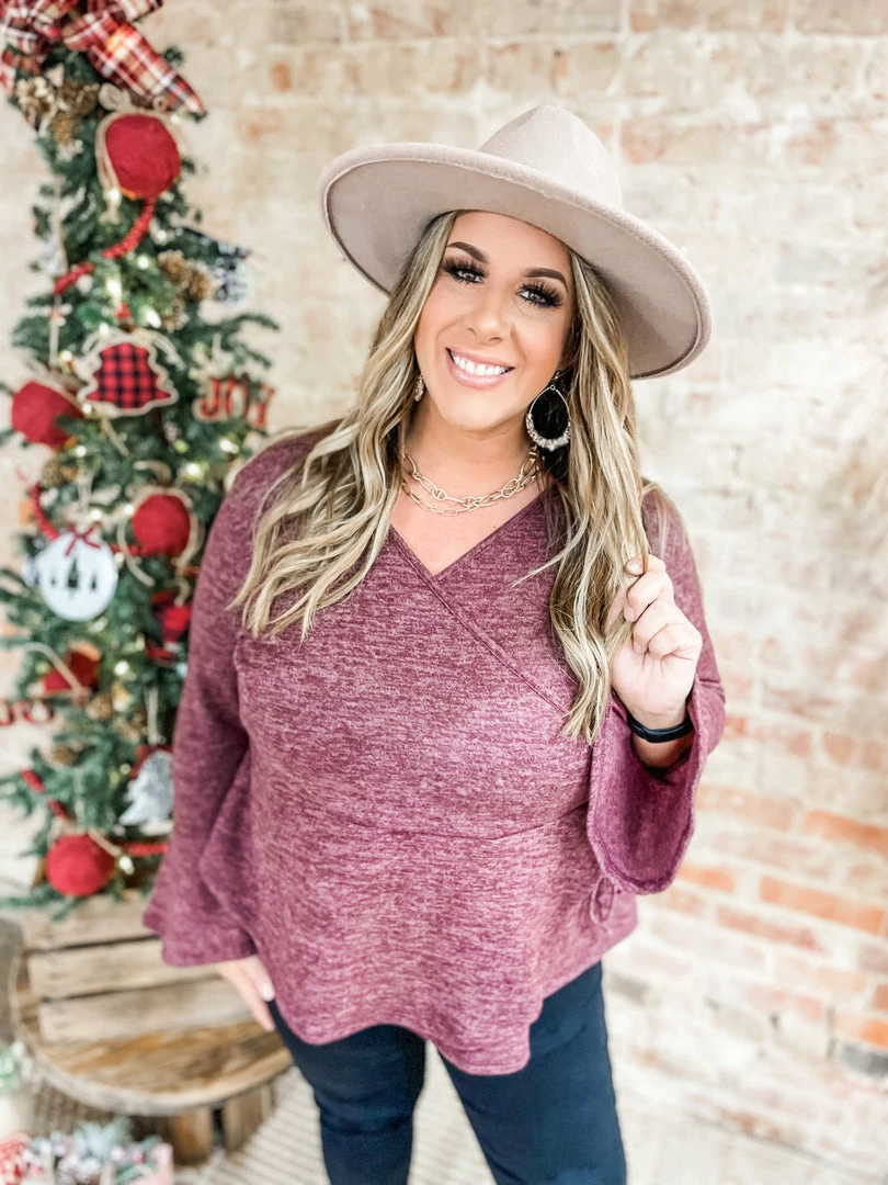 Ultimate chic winter style can be achieved with our Claire Top! Featuring a v neckline + long bell sleeves + peplum fit + bow tie detail! The color and cozy soft material make this item extra sweet! Styled with our Koda Chunky Chain Detail Felt Hat, Abby Booties and Dion High Rise Slim Straight Jeans.