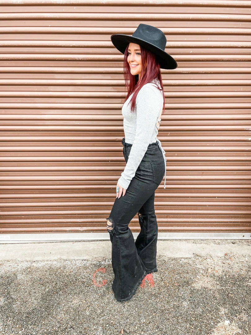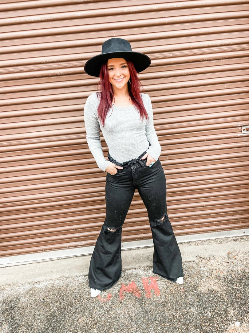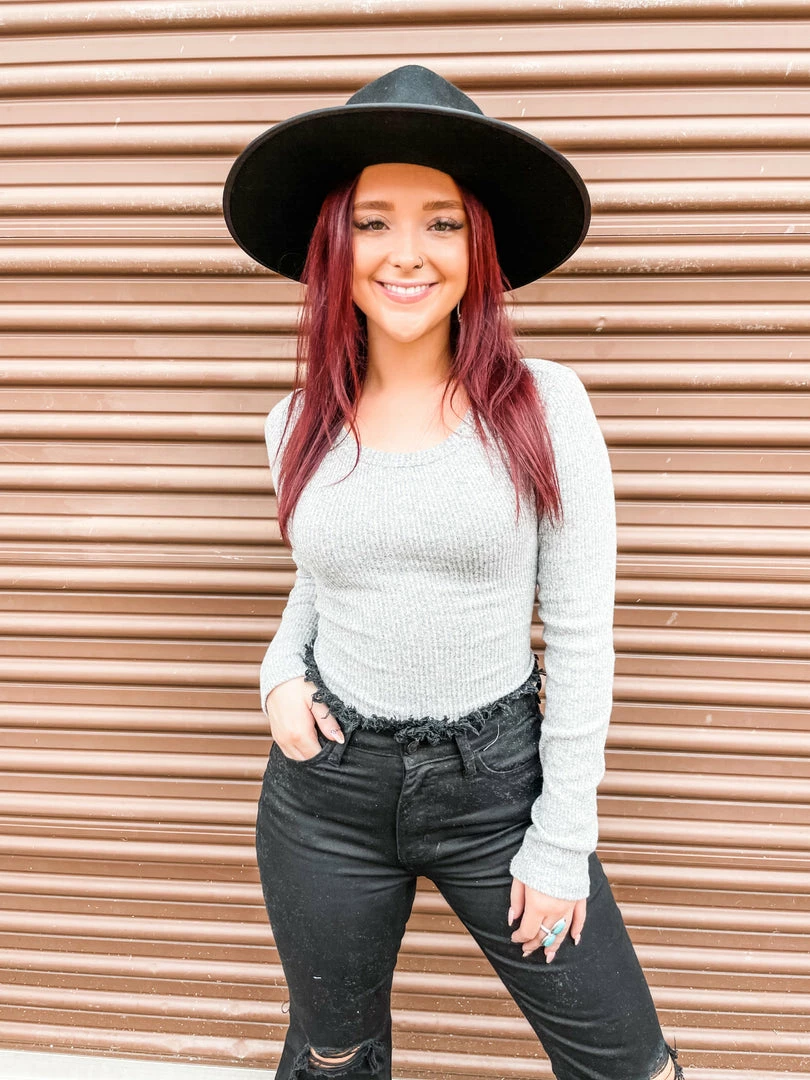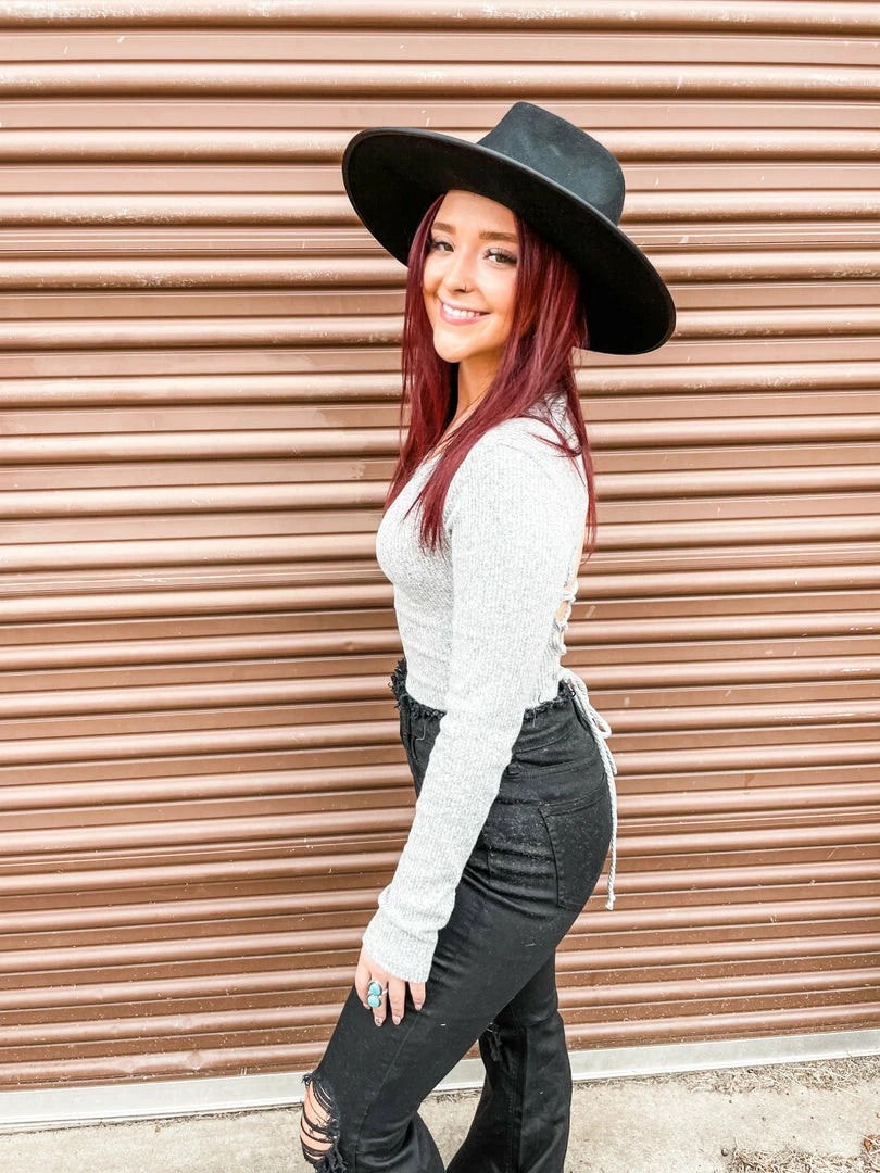The Emery Open Back Bodysuit is all about comfort while providing a look to remember! Designed with a curved neckline, long sleeves and 2 snap button closure. Finishing with an open back detailing with tie! The fabrication is so lush and soft, perfect for fall & winter date nights! Styled with our Aliza Tone on Tone Felt Hat, Reno Boots and Mabel Black Distressed Flare Jeans.