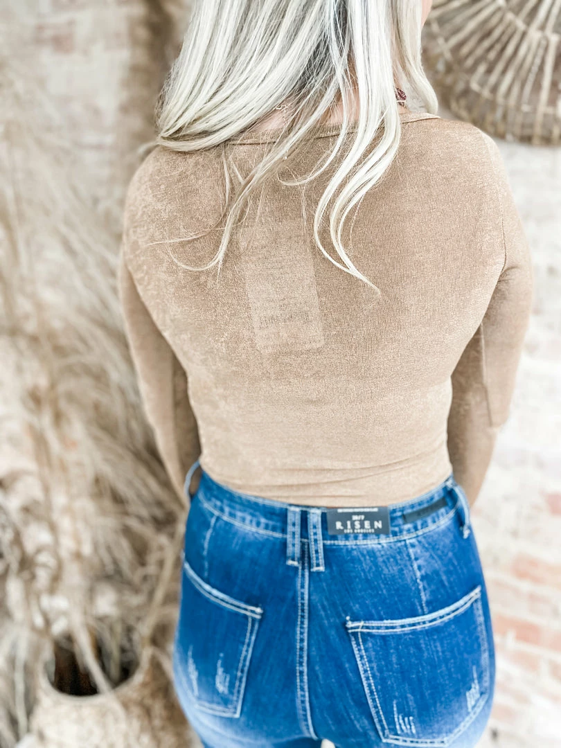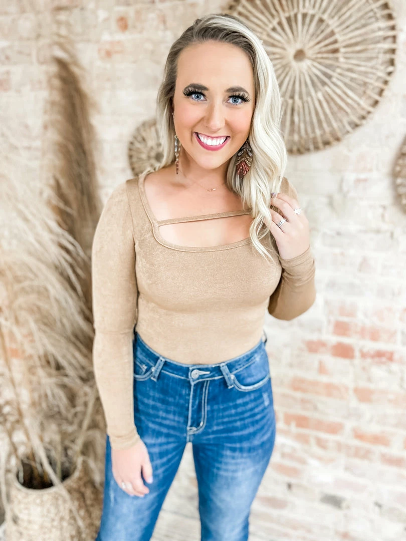 Our Piper Cross Strap Bodysuit is a wardrobe booster! Designed with long sleeves, scoop neckline with line detail and 2 snap button closure. The fabrication is lush and lightweight. The shimmer it provides gives you a dressy style! We love this bodysuit for date night and fancy fall festivities! Styled with our Kimbo Booties and Nyla High Rise Vintage Frayed Hem Flare Jeans.