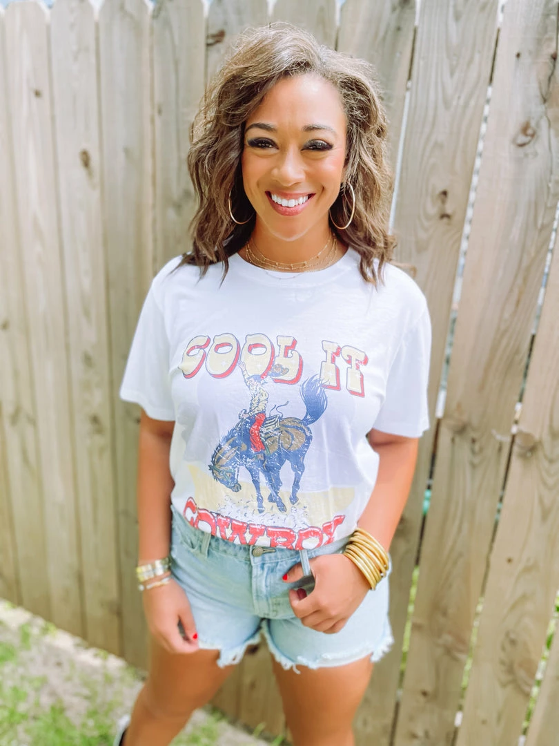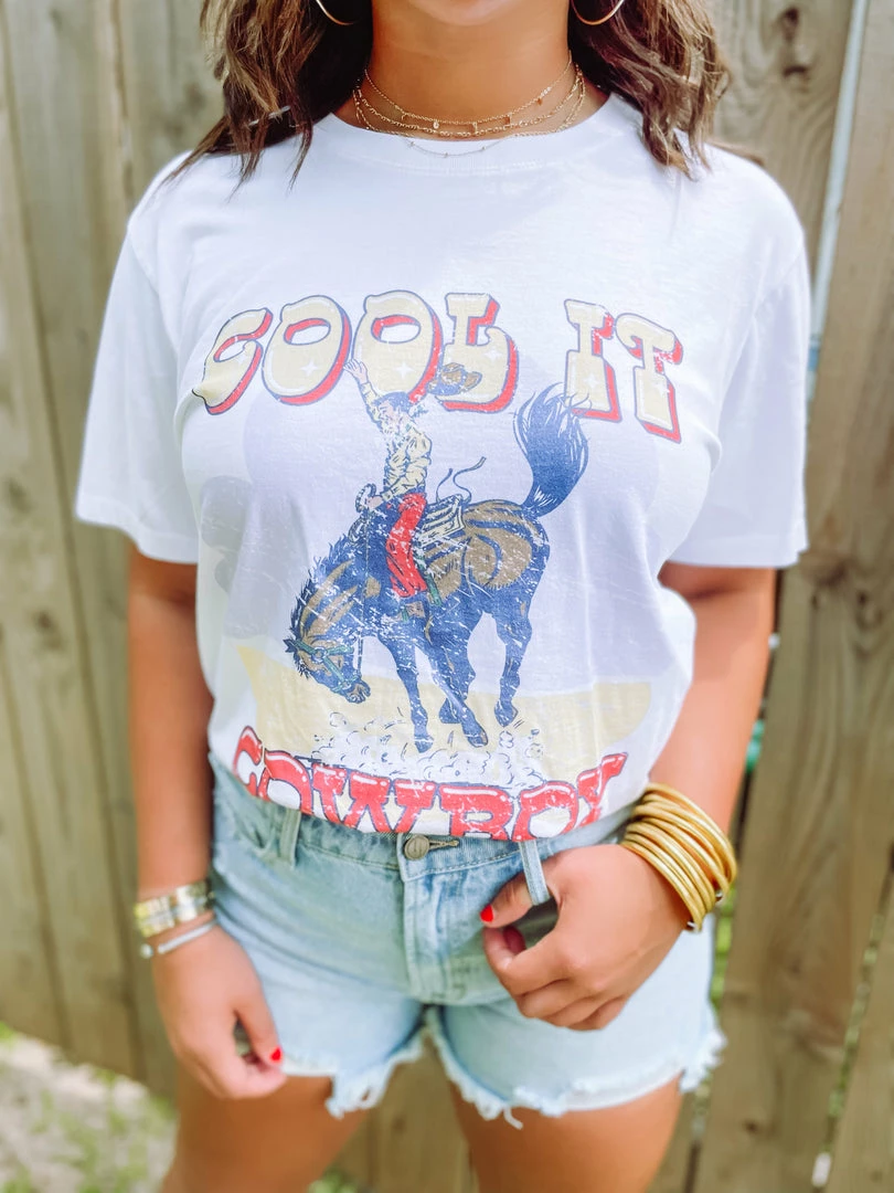 Keep it chill in our Cool It Cowboy Graphic Tee. Designed on a white shirt + with bubble lettering + perfect graphic. This top will be a staple in your closet all year long! Styled with our Teagan Western Ruched Boots.
