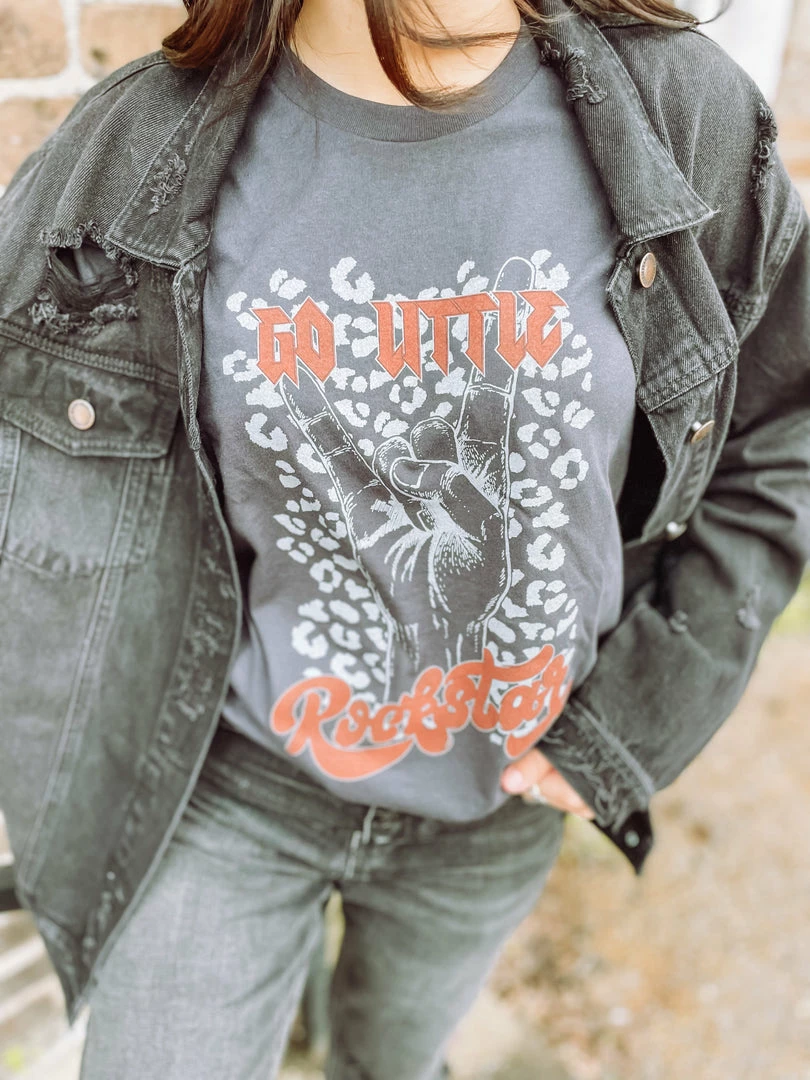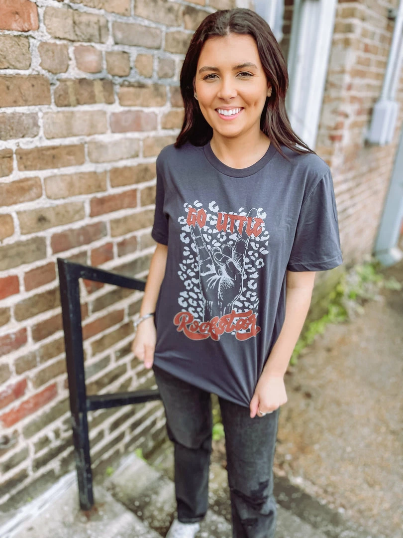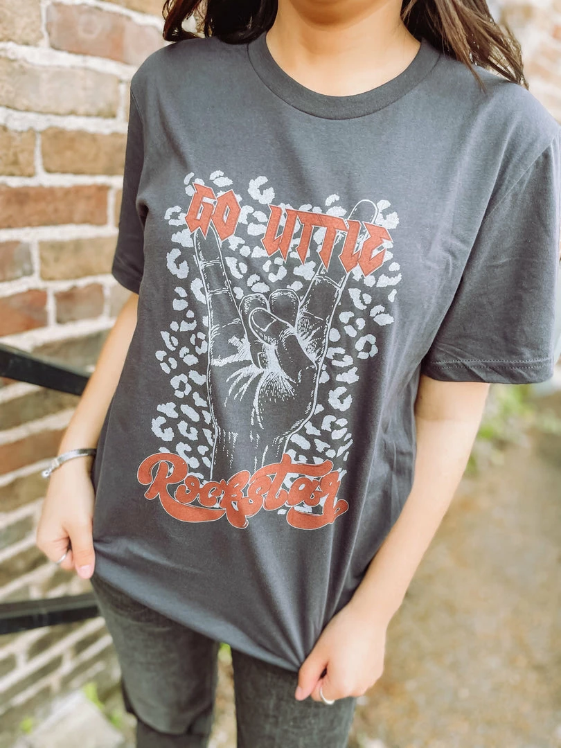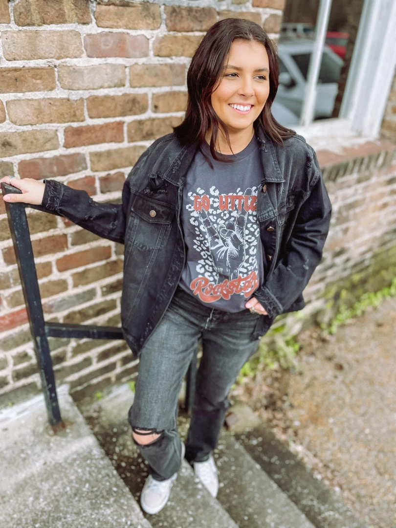 Go Little Rockstar!! To all our music loving hearted gals out there, our newest tee is meant for you! Featured on a Bella Canvas top is our edgy spotted design. This item is begging to be styled for your next concert!! Perfectly paired with our Clara Ultra High Rise Straight Leg Jeans, Elena High Tops and Lydia Black Distressed Denim Jacket.