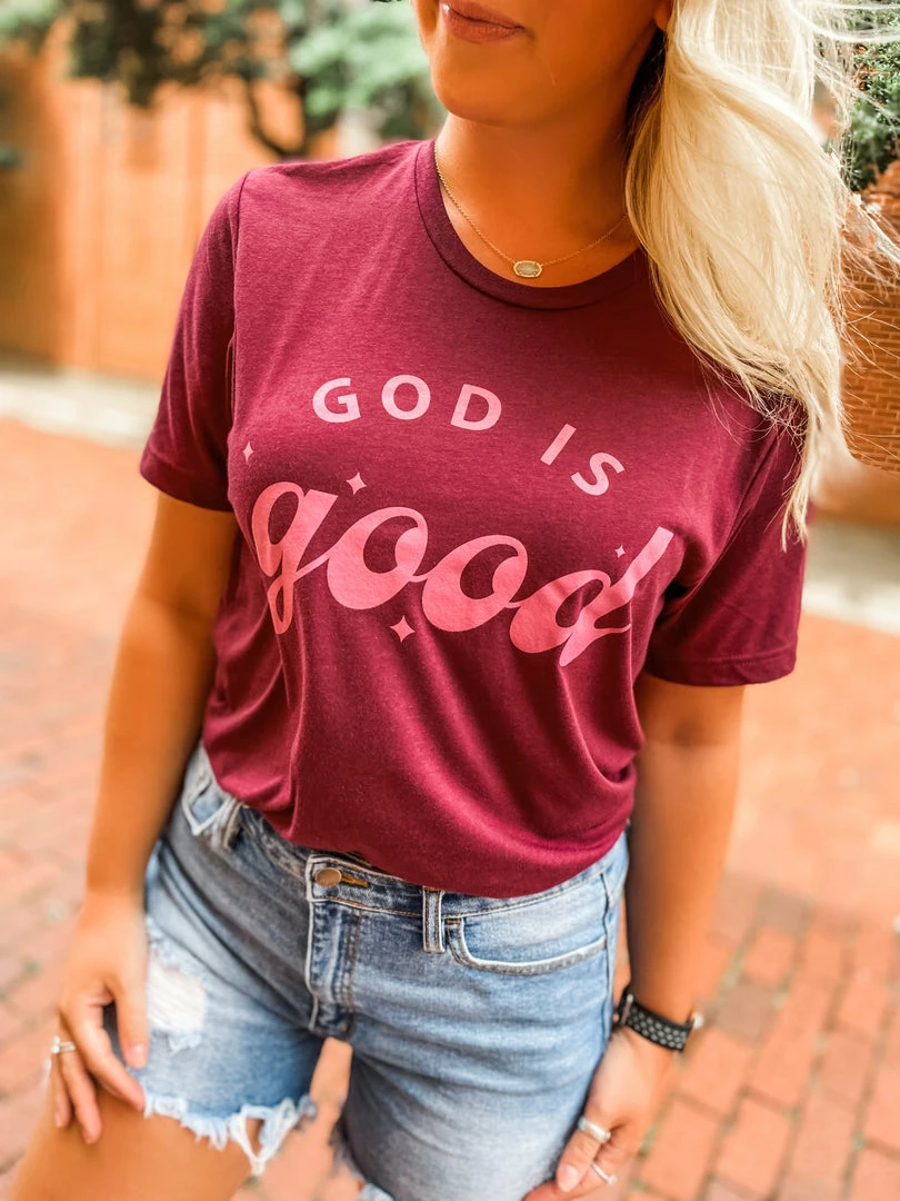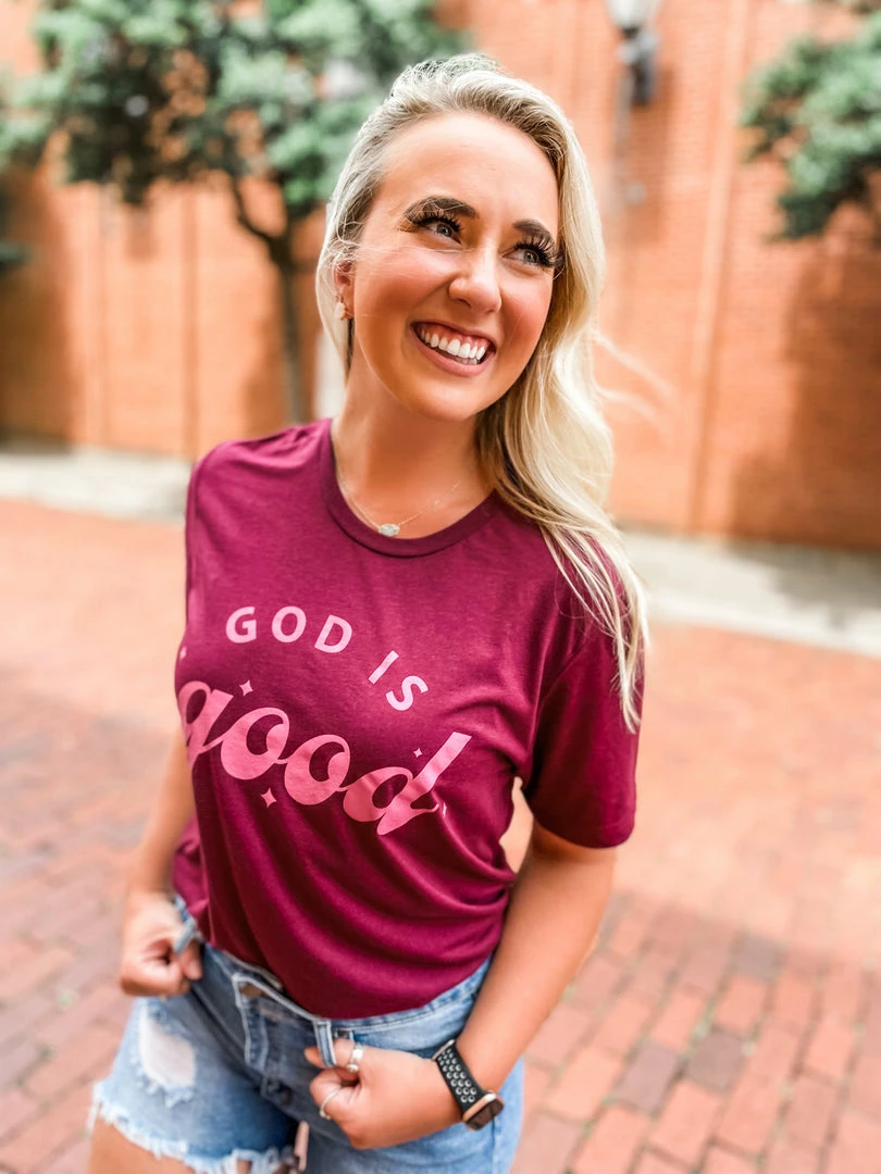 Say it with us GOD! IS! GOOD! He is our God and so so good! Featured on a maroon triblend super soft tee is our precious design. A great reminder made fashionable!