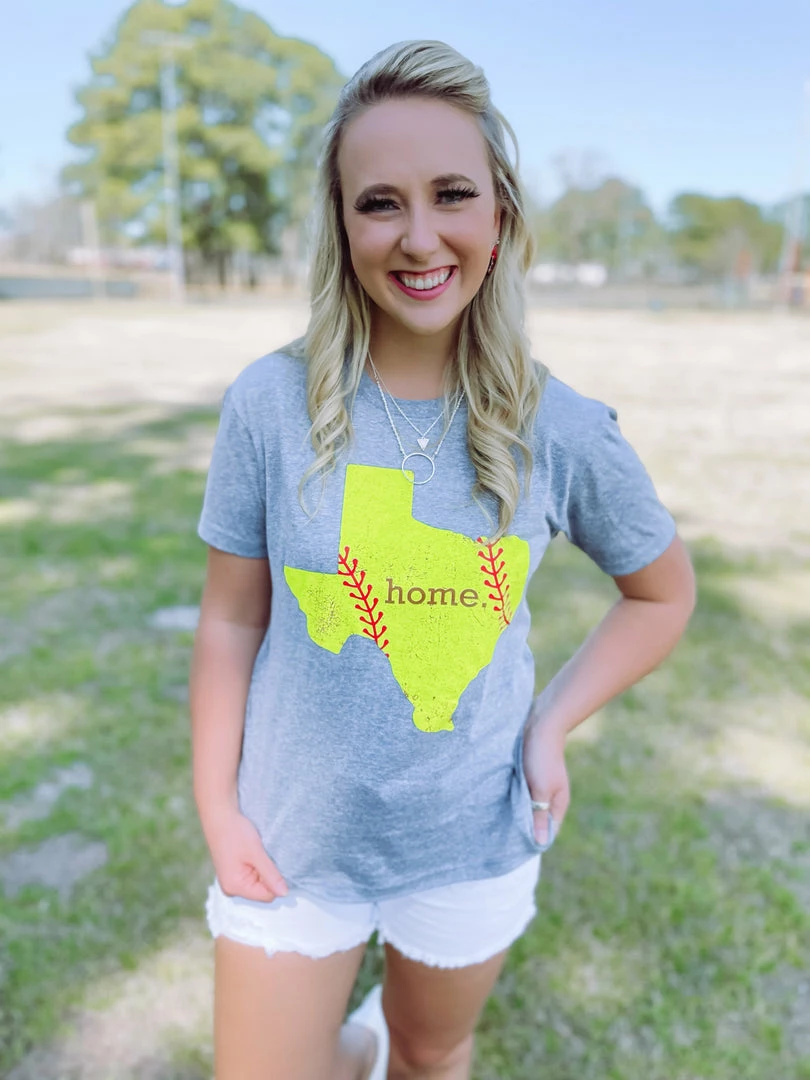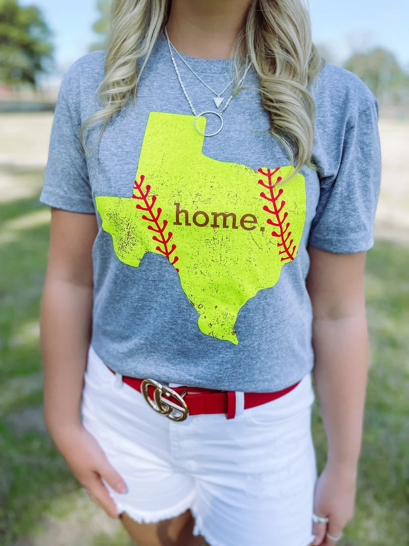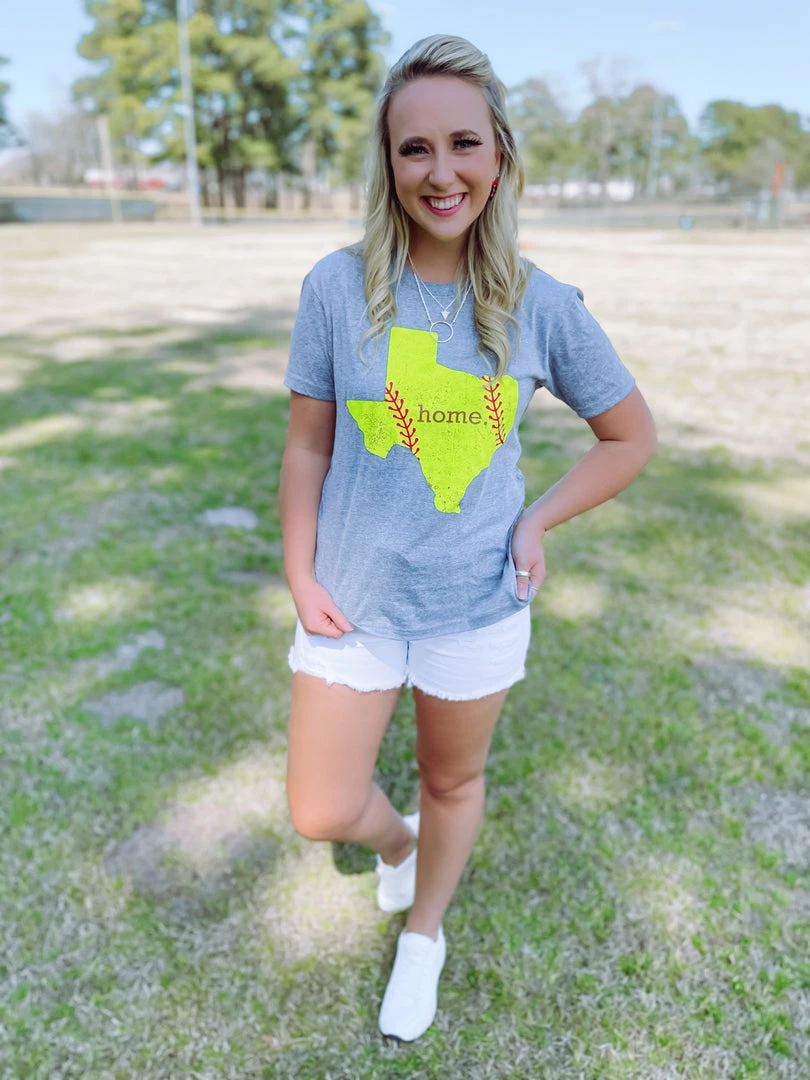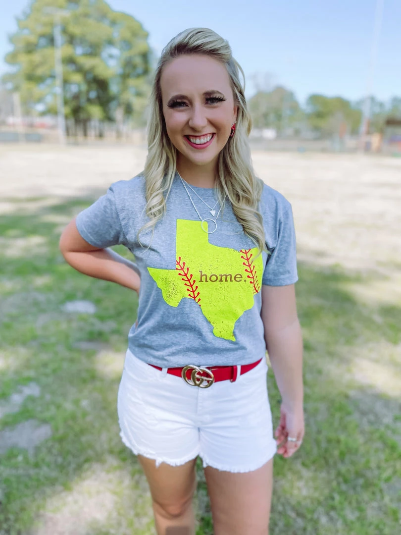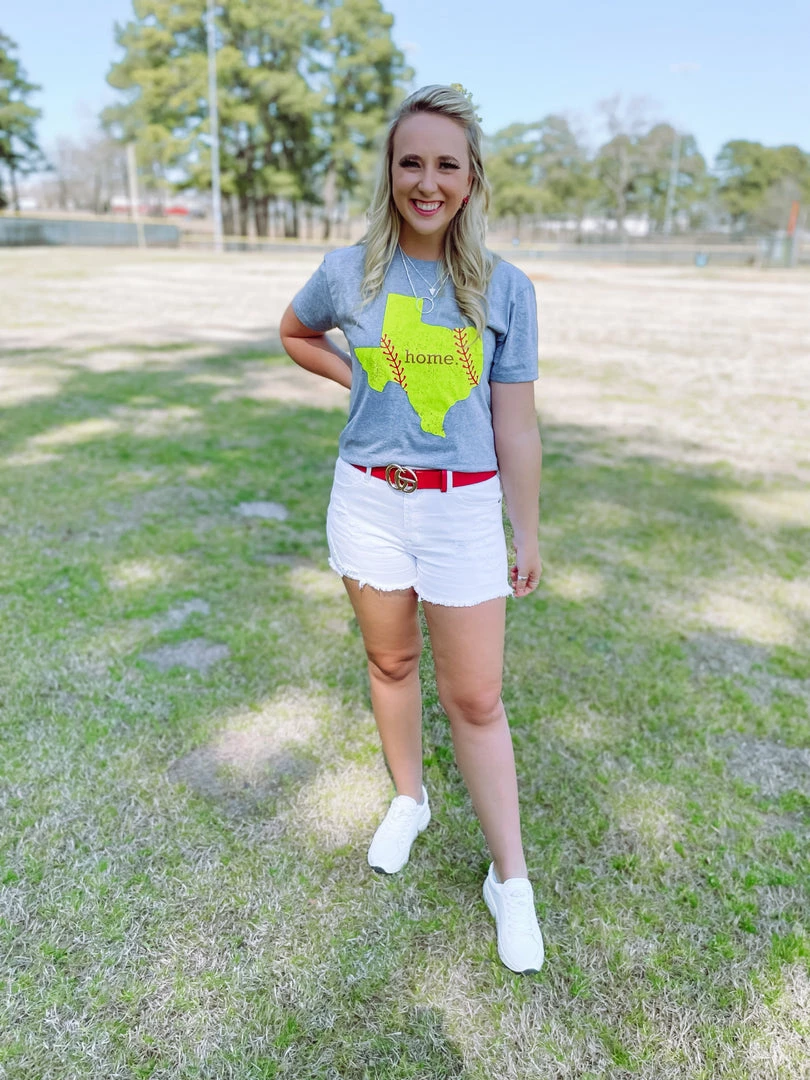 Love it. Live it. Play it! Our Texas Home Softball graphic tee is ready for every day wear this season! Featured on heathered top is our bold design! Style with leggings and sneakers or dress it up with skinnies and sandals! Perfectly paired with our Avery Sneakers, Hadley High Rise Distressed Hem Shorts and GG Red Textured Belt.