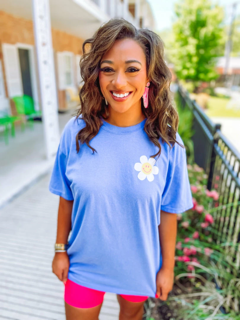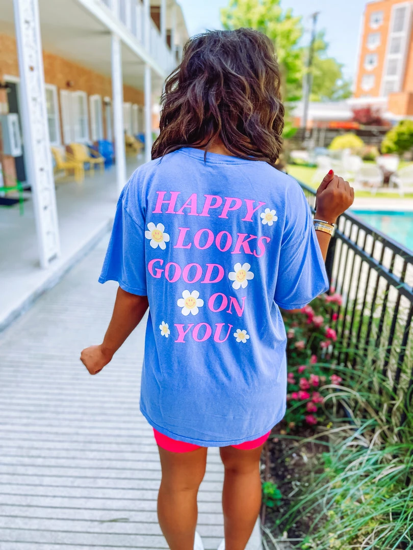 Happy Looks Good on YOU!!! Keep smiling sister! This fun tee is great for road trips, class, weekend fun, or just because you can never have too many t shirts – this one is a necessity for sure! Styled with our Kylie High Rise Biker Shorts.