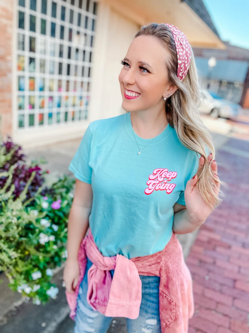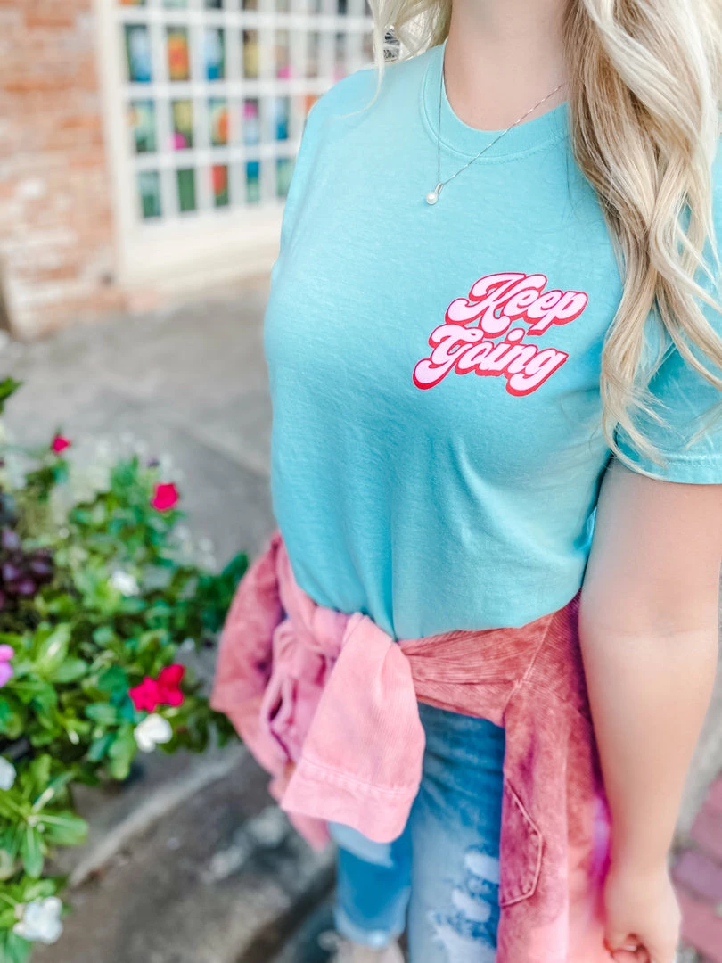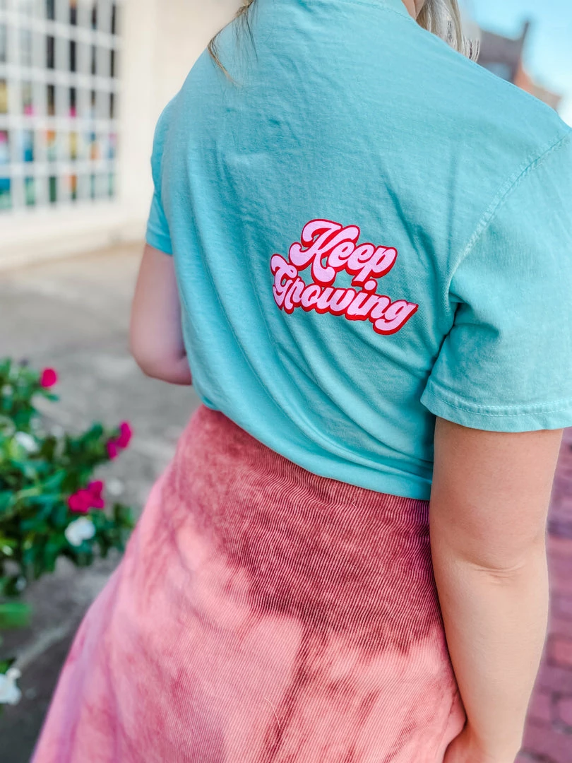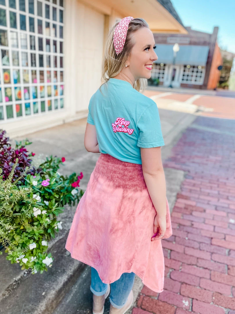 You GROW girl! This red + pink color combo is stealing hearts and making the best gift to give yet! Graphic tee stylin’ just got a whole lot sweeter thanks to this tee! Styled with our Charlotte Acid Wash Ombre Corduroy Shirt, Paula Lace Up Boots and Bethany Roll Cuff Relaxed Skinnies.