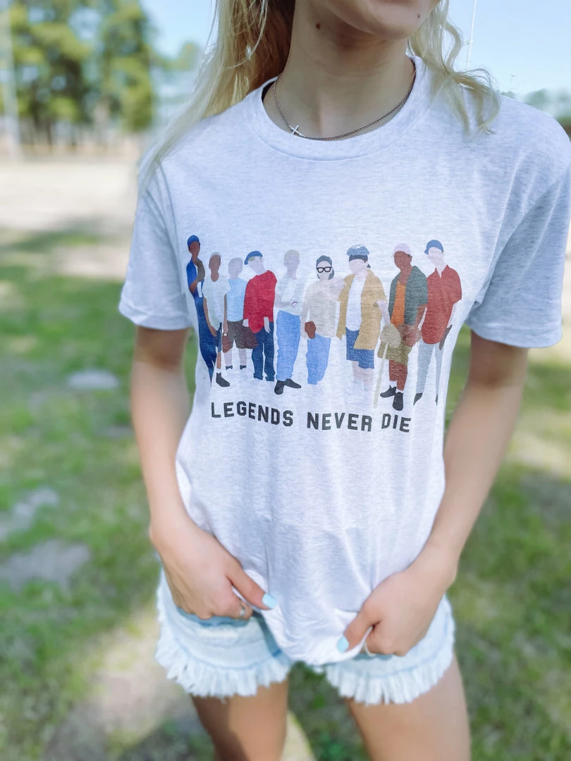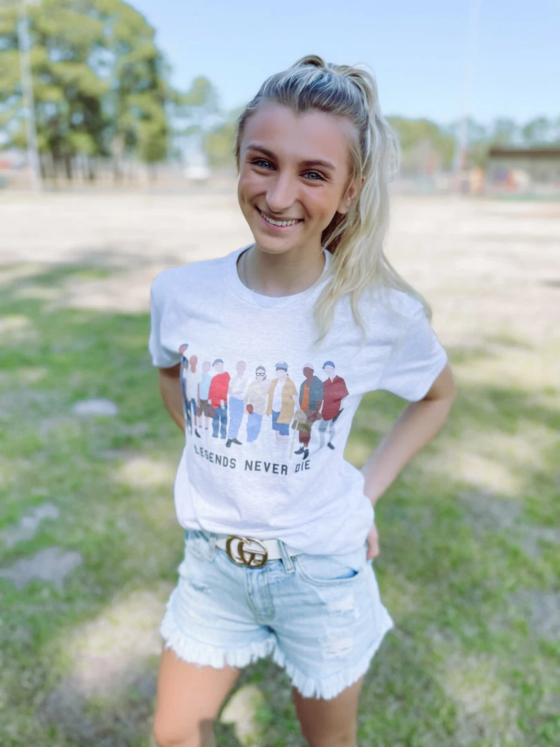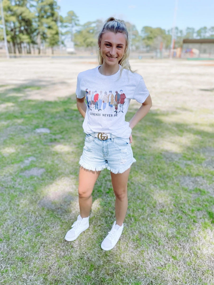 Baseball Legends — This tee hits home in so many ways! Featured on a lightly heathered tee is our epic fun design! This tee is a classic! Perfectly paired with our Elena High Tops, GG Belt and Jade High Rise Cut Off Shorts.