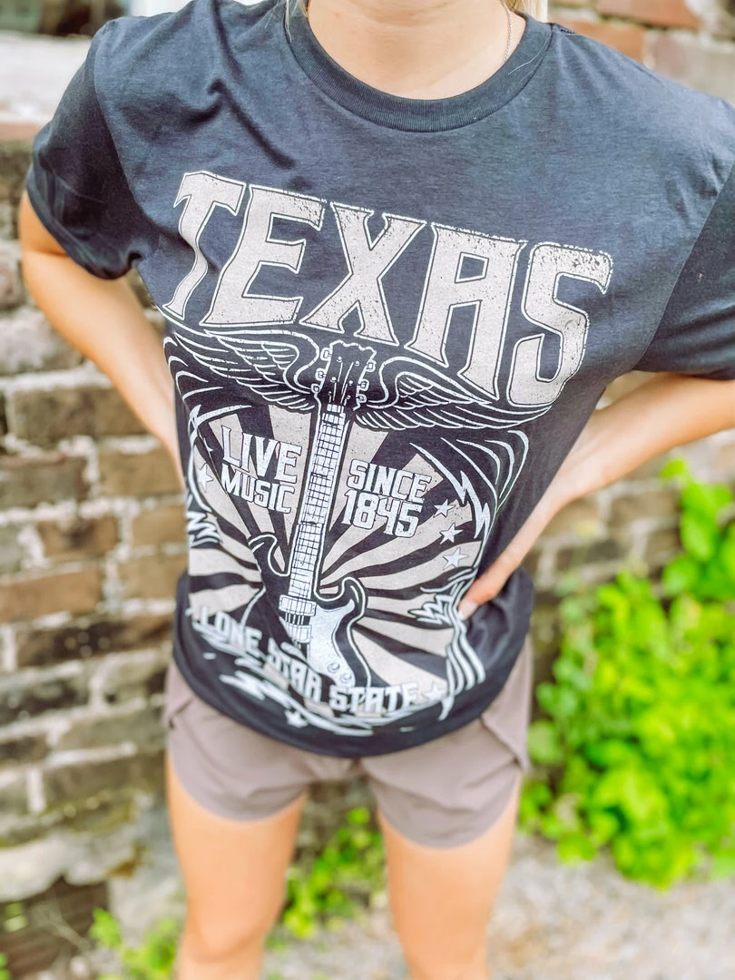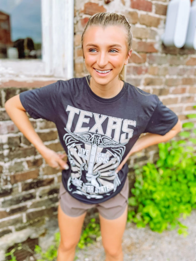 Basic Tee with an edgy country vibe! Our Texas Guitar Tee is definitely our new favorite! We love this one styled with a denim skirt & boots OR skinnies and wedges! A graphic tee offers you endless outfits, that’s why they are our go to! Styled with our Sonia Fitted Athletic Shorts.