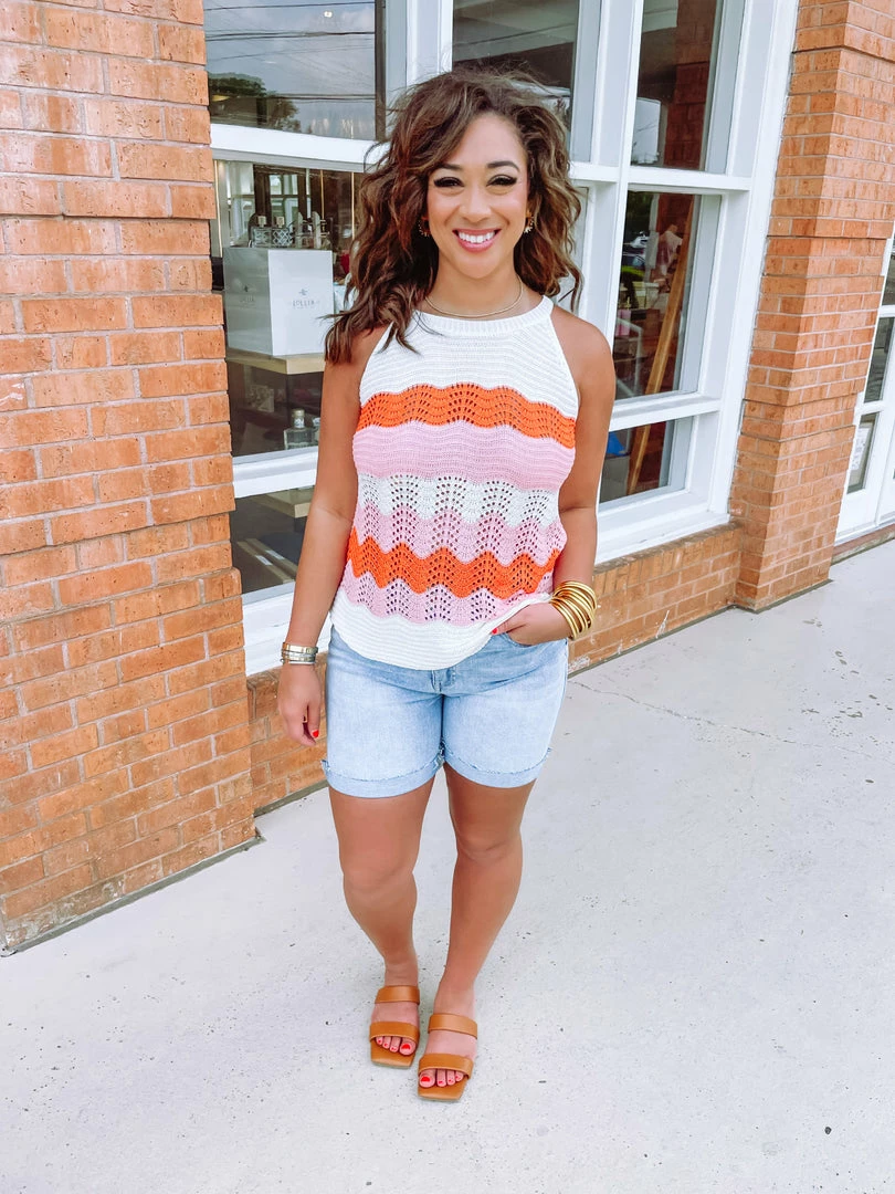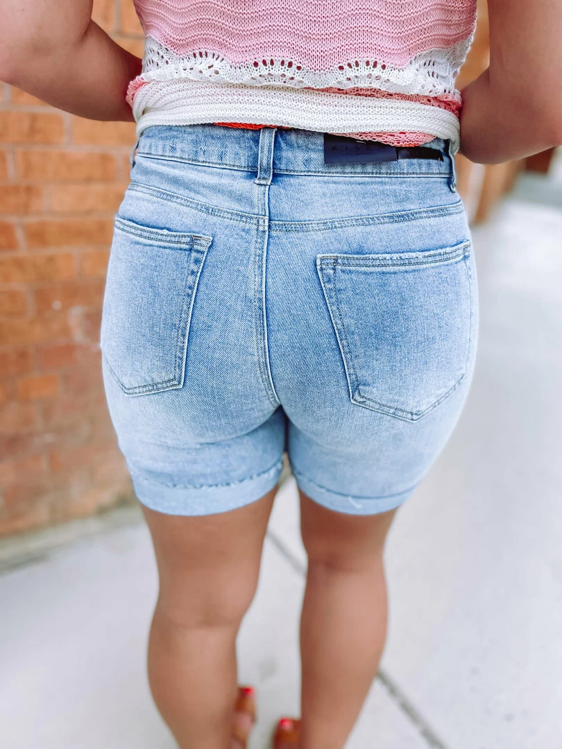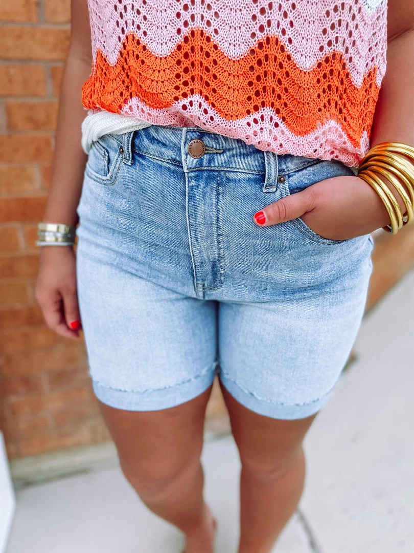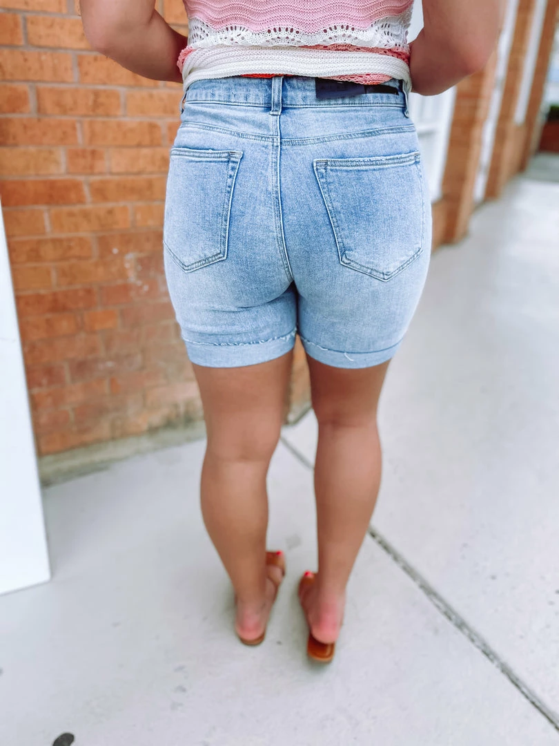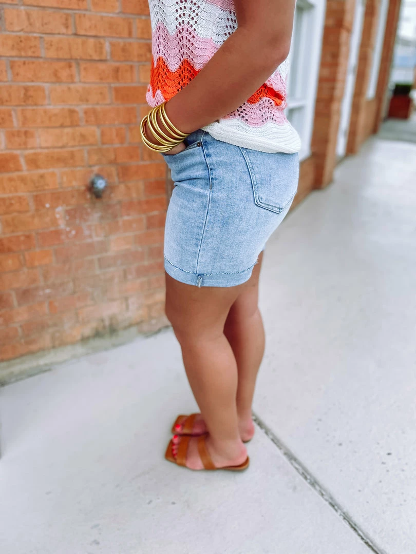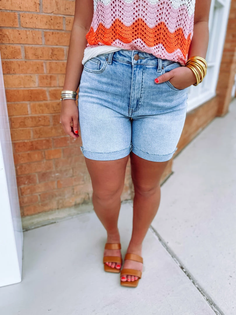 Denim for days! Our Addy Shorts are tailored as mid rise with your classic 5 pockets + belt loops + button/zipper fly! A cuffed frayed hem with no other distressing complete these no – stretch shorts! Light wash shorts with a comfy length, need we say more?! Styled with the Libby Knit Tank Top + Ramsey sandals + the Katrina Earrings.