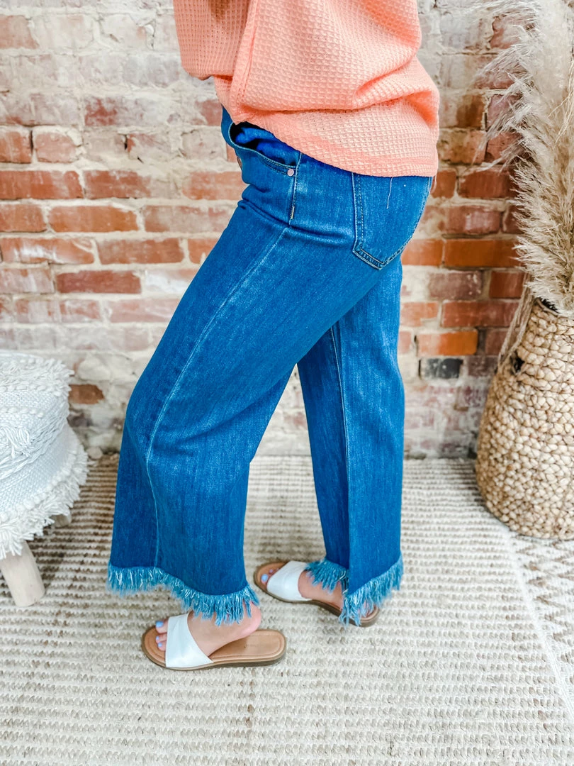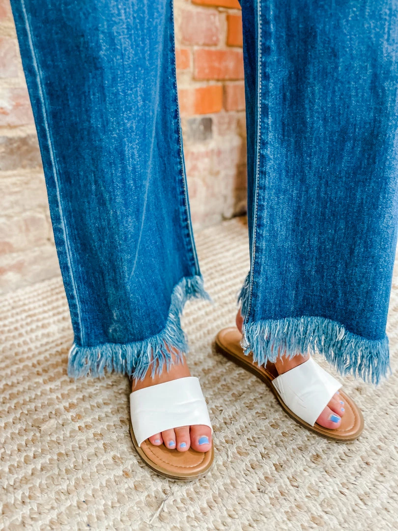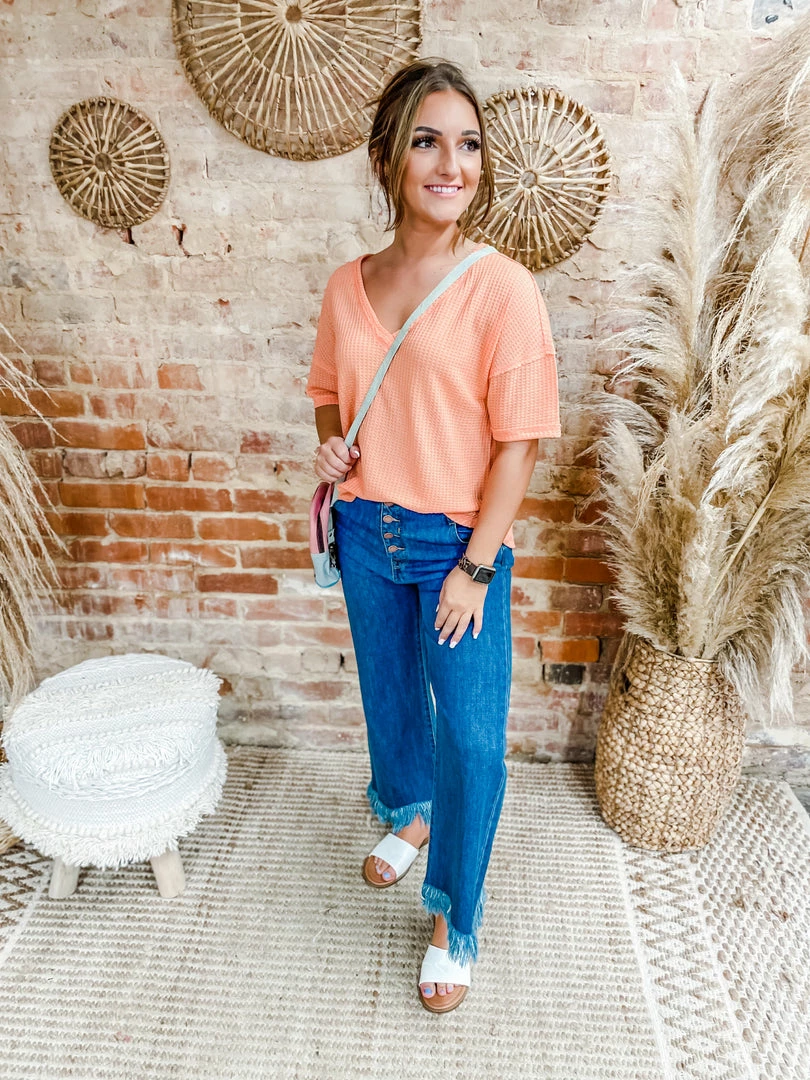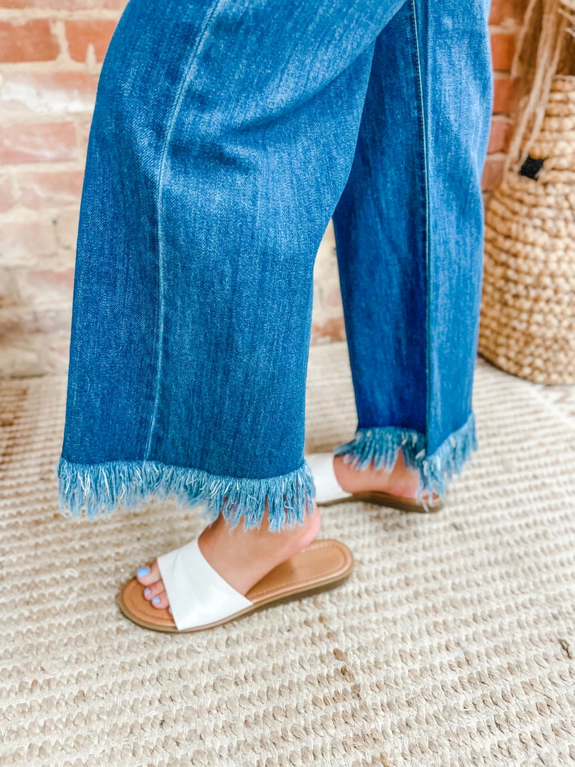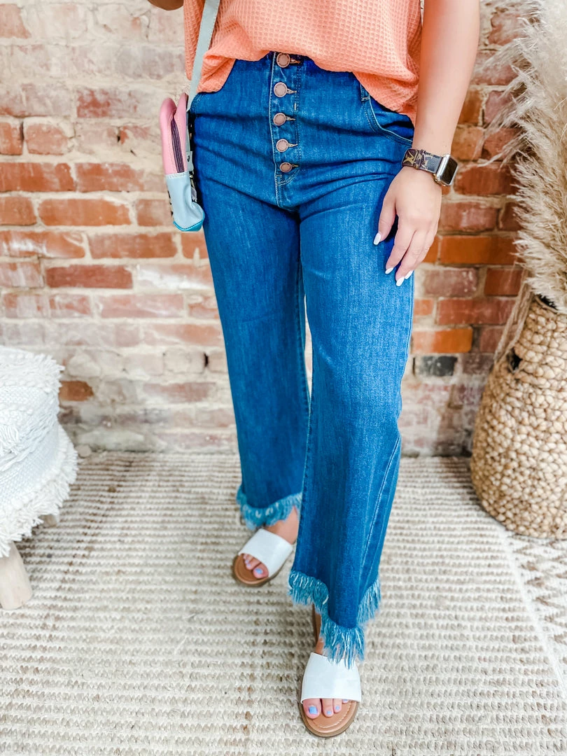 Fashion forward style brought you by the Adeline Button Down 90’s Frayed Hem Wide Jeans! YES YES YES all your favorite details for back to school and fall fit! Tailored with a button down fly + frayed hem + high waisted! Styled with our Heidi Sandals, Poppy Crossbody/Backpack and Lennox Waffle V Neck Top.
