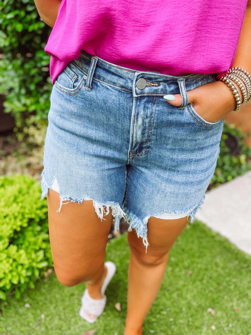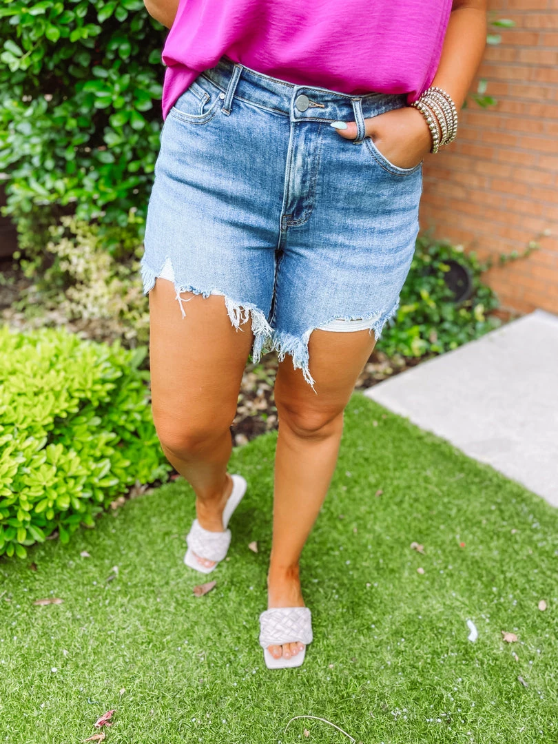 You’ll find great summer style in our Bryanna Frayed Hem Shorts! Showcasing frayed raw cut hem with major whiskering + 5 pocket design with zip/button fly + distressed details! These shorts provide an edgier summer look that we are crushing on big time! Paired perfectly with our Rebecca Crochet Lace Top + the Apron Sandals.