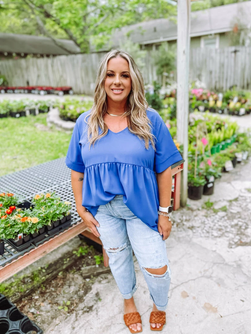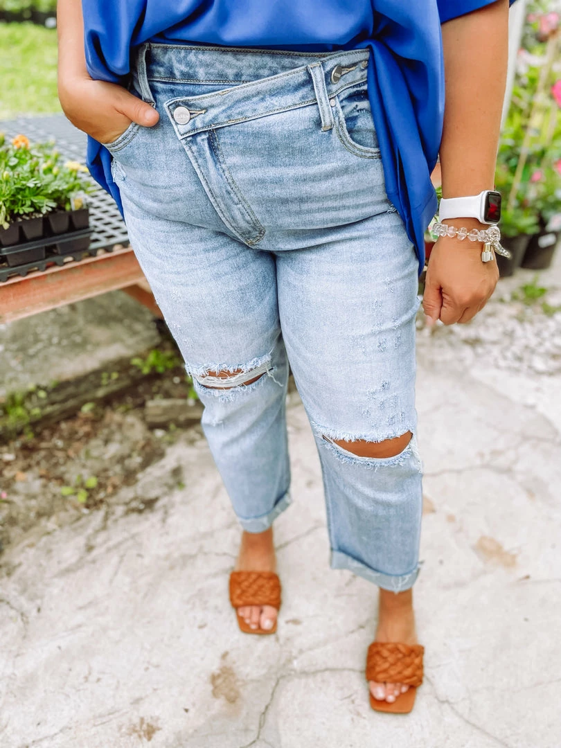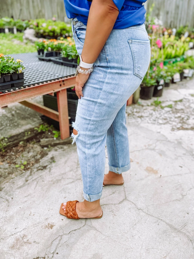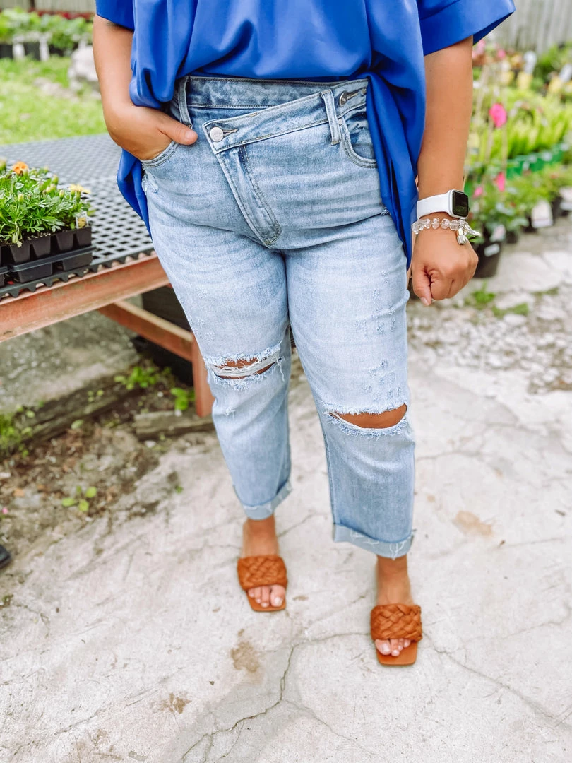 The Camille Jeans bring fashion forward style to your wardrobe! Designed as high rise + crossover button + button/zip fly + belt loops + 5 pockets + intentional distressing. Step up your denim game with these must have jeans! Styled with our Apron Sandals and Morgan Waist Shirring Top.