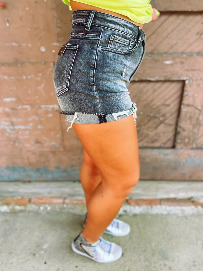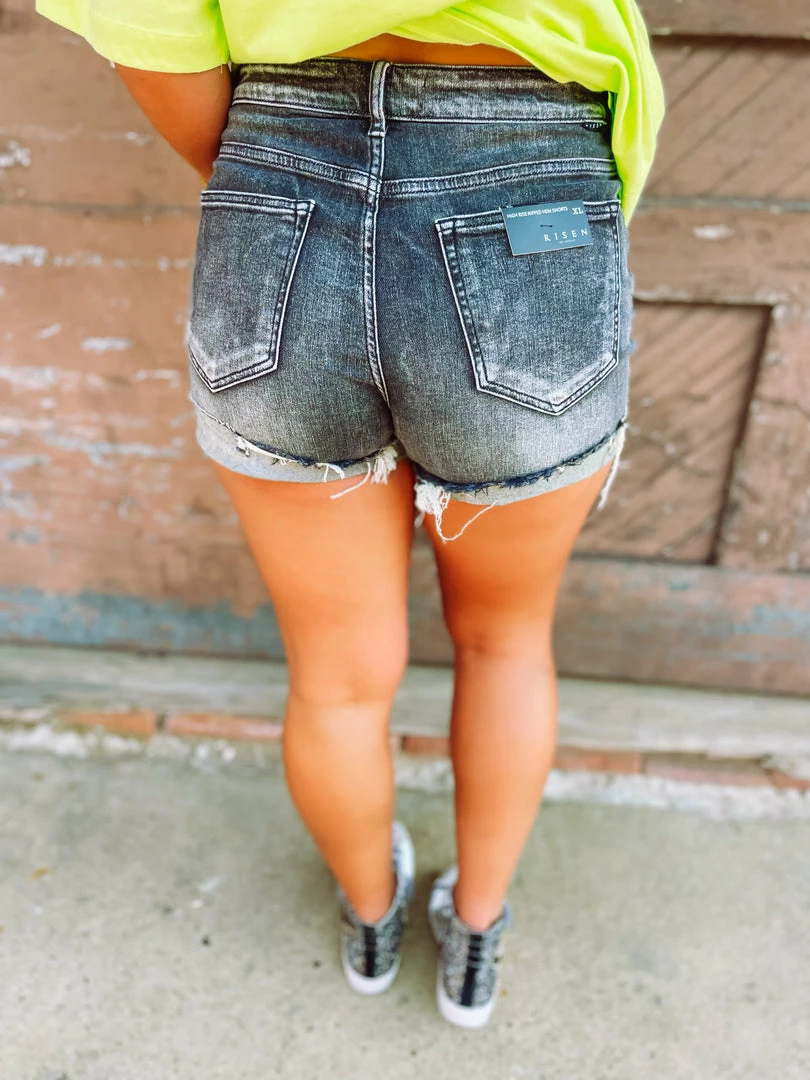 The April Shorts will add an edgy vibe to any look! Tailored with a high waist + 5 pocket design + distressing + cuffed hem. These are perfect paired with your fav bodysuit, top, or graphic tee! Styled with the Skull Rock n Roll Tee + the Passion Star Sneakers.