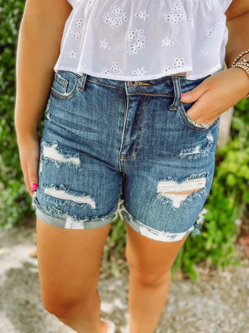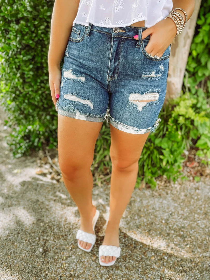 Meet our Cali Mid Thigh Shorts! Showcasing pure summer fashion! Featuring a front button/zip closure + frayed cuffed hem along with distressing elements + classic 5 pockets! The dark wash makes these casual and easily dolled up! Styled with our Lisa Ruffle Top + the Ball Twist Sandals.