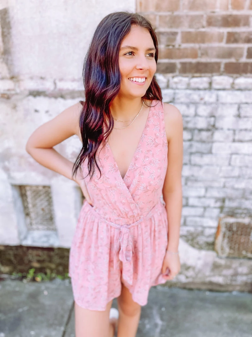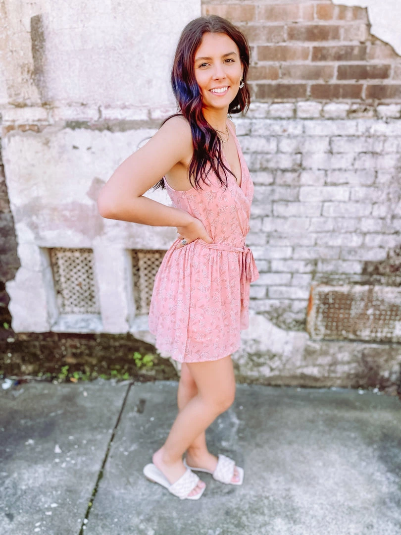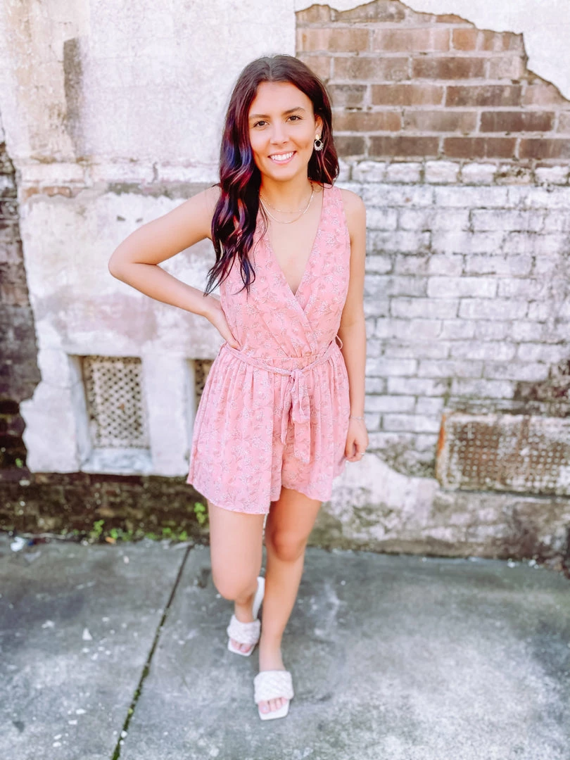Stop, Drop, & SHOP! The Jolie Floral Print Romper is not holding back! Showcasing a v neckline that leads to tie detail on your waist + fully lined + back zipper! Pair with your fav denim jacket or dress it up & steal Hallie’s outfit! ~ Styled with our Apron Sandals.