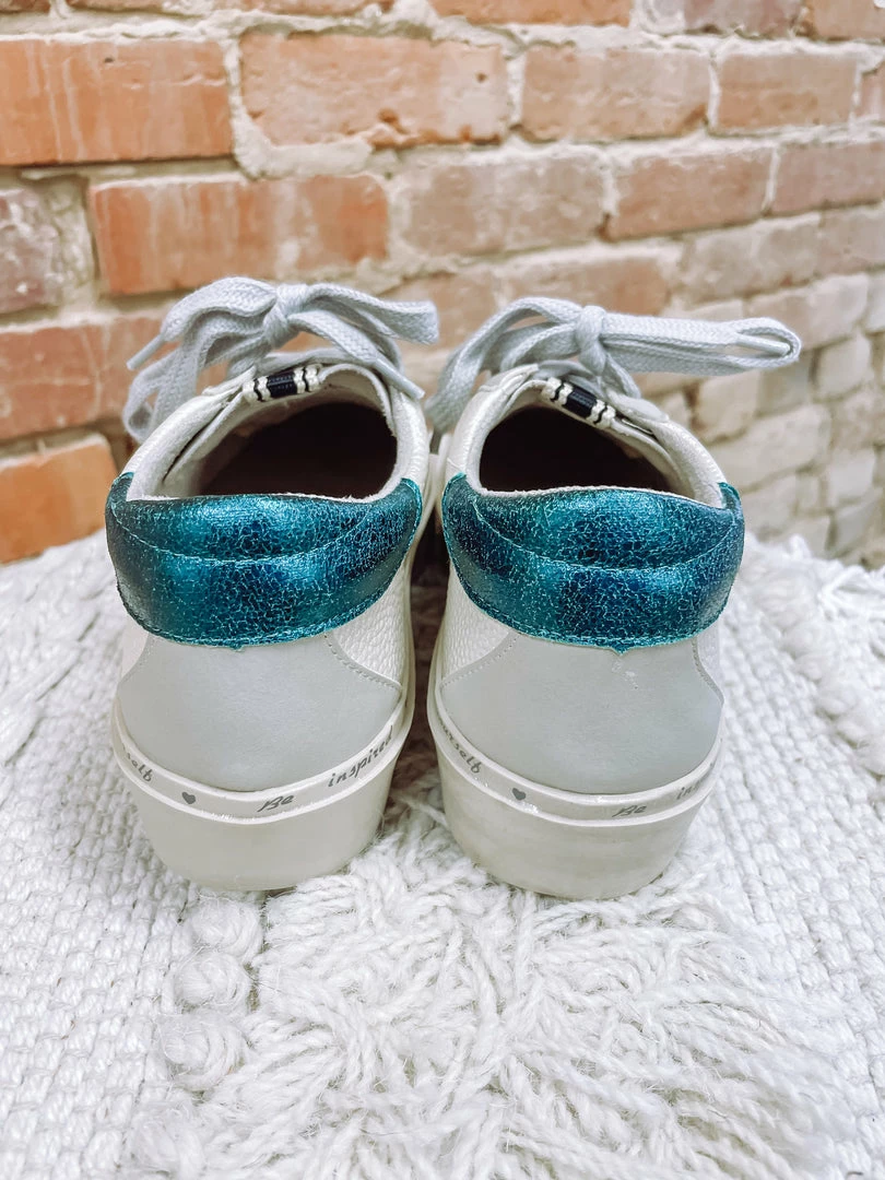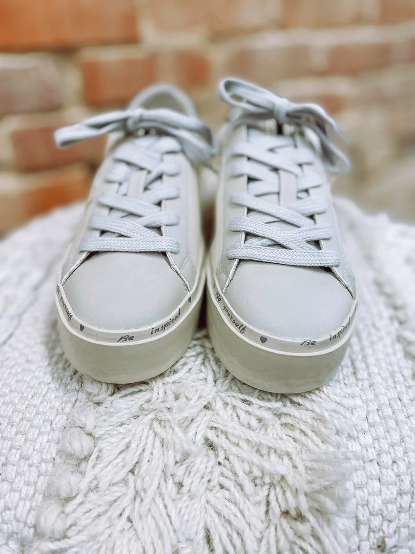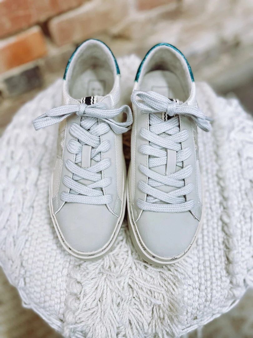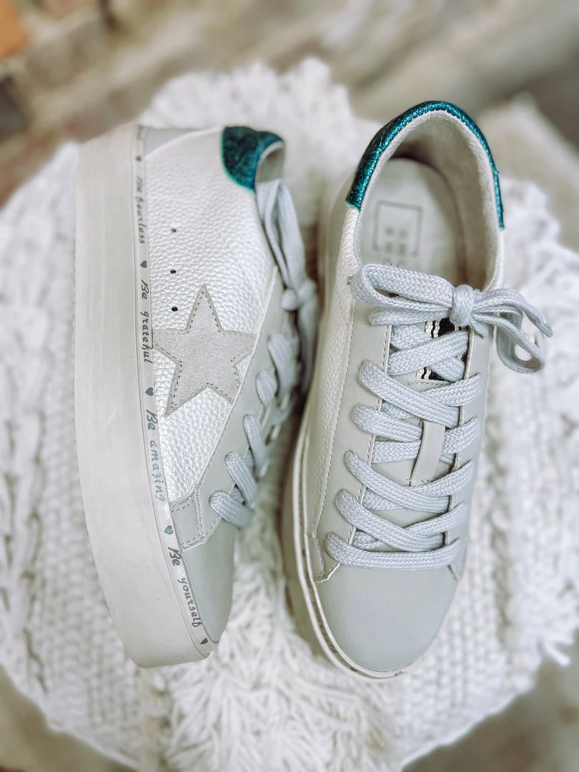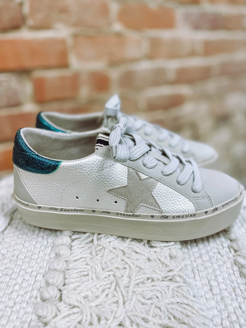 Kick around in our Petula Star Sneakers! This everyday low-top sneaker walks with a mix of beige and white faux suede and faux leather uppers, detailed with a side silver star design, teal features and grey laces to finish the look. Finish all your fav looks with these must have sneakers!