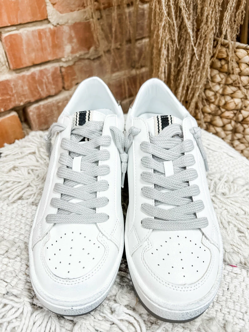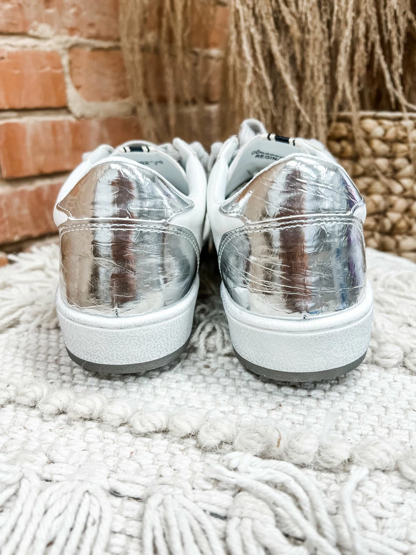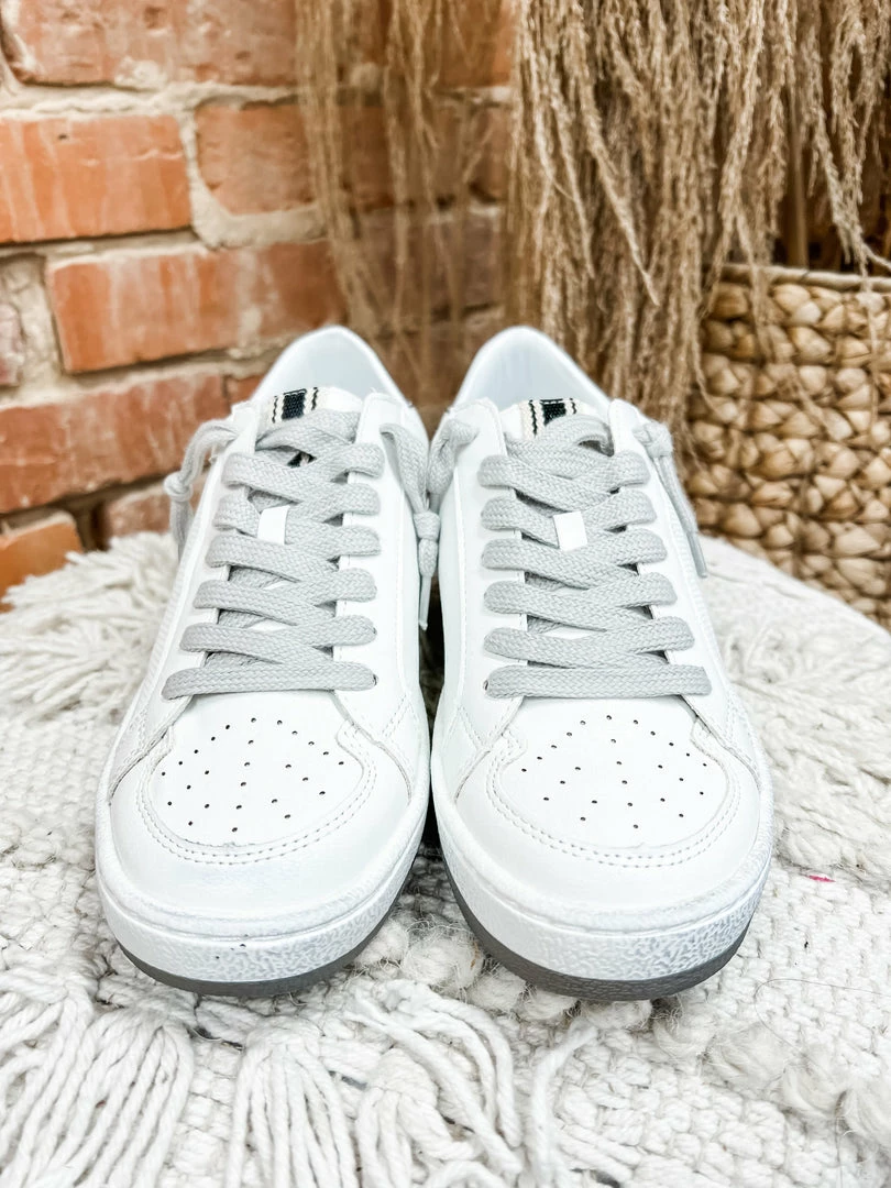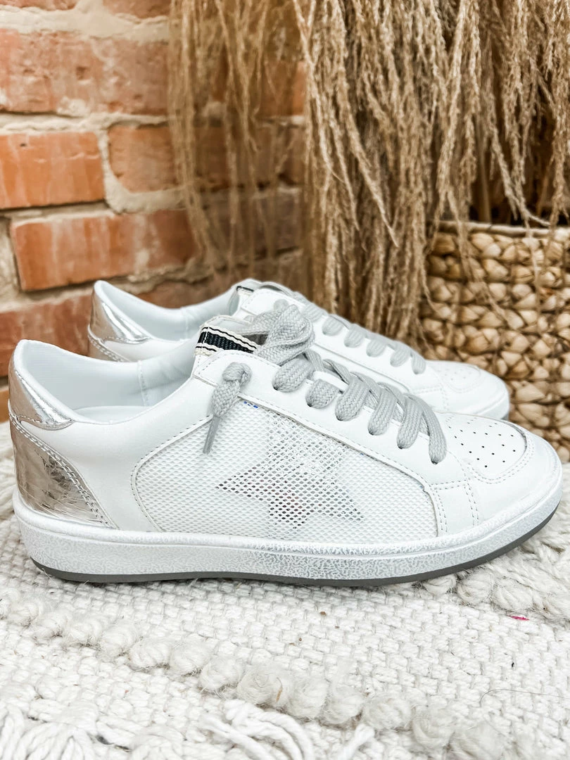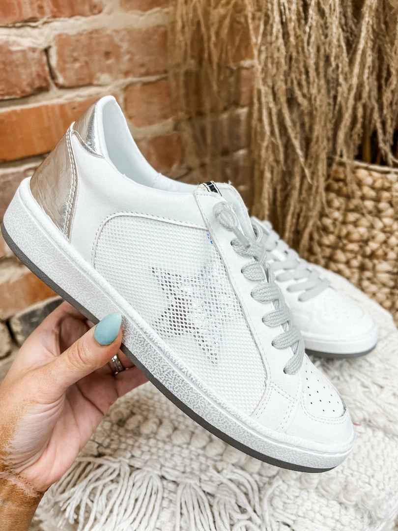 Kick around in our Regina Star Sneakers! This everyday low-top sneaker walks with a mix of silver and white, detailed with a side star and mesh design and grey laces to finish the look. Finish all your fav looks with these must have sneakers!