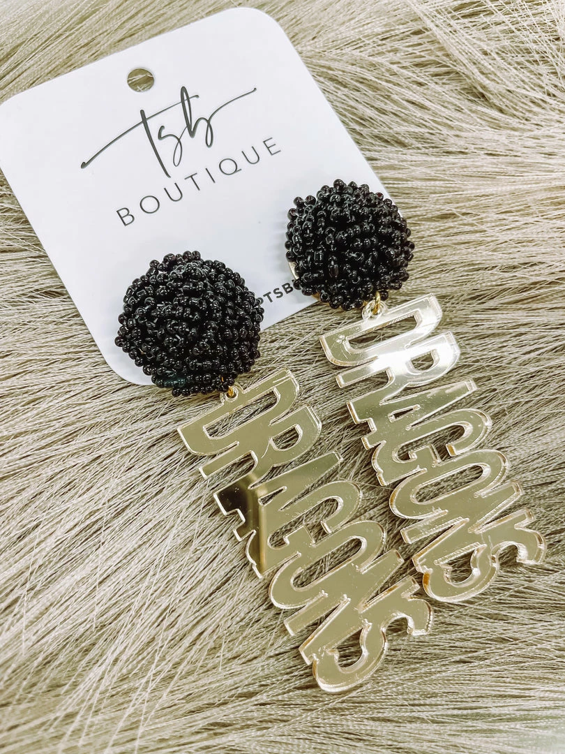 Texas Bling 2022 School Style Gold Dragons Black Pom Earrings