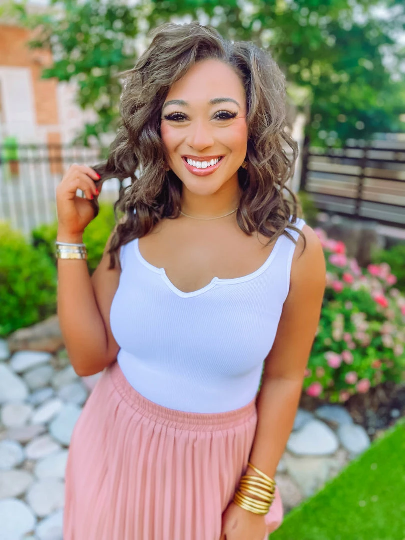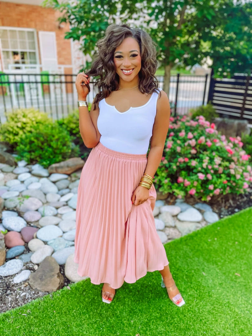 Our Alexis Bodysuit is soft and stretchy as ever in a premium ribbed knit material! Featuring a cut v neckline + banding + clasp closure. It beautifully pairs with literally everything! A basic worth every fashionista moment! Styled with our Jenny Pleated Maxi Skirt and Clara Clear Heel Pumps.