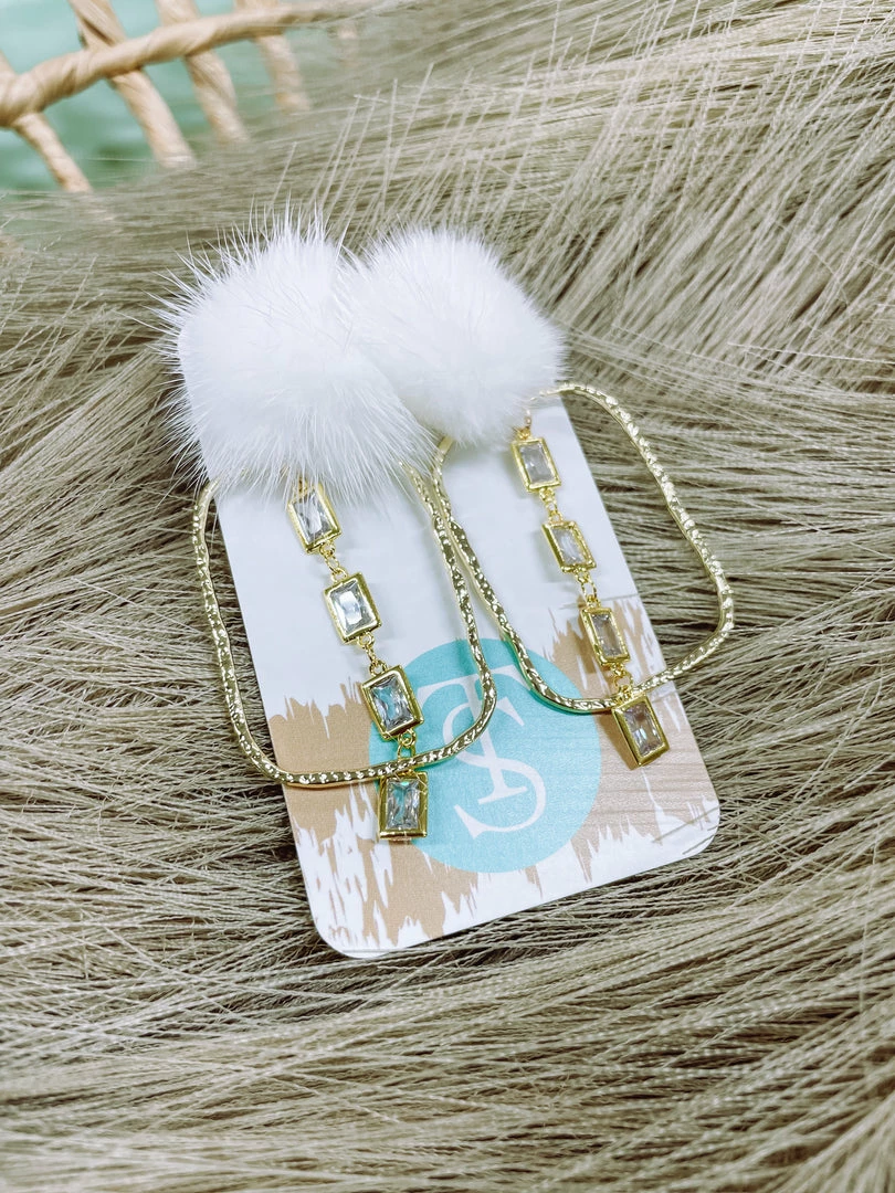 Make a statement with the Andi Earrings! Showcasing an ivory puff + rectangle dangle + crystal drop element! An absolute must have for weekend get aways and brunch with the girls!