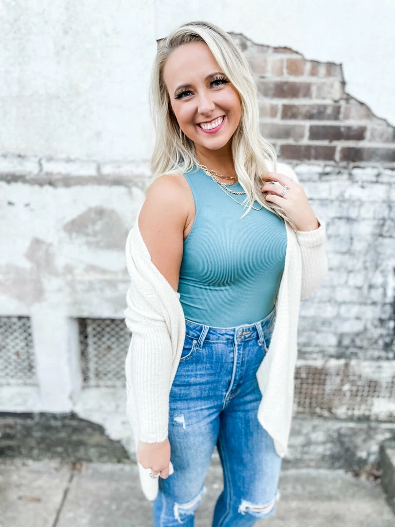 The April Ribbed Muscle Tank Bodysuit is soft and stretchy as ever in a premium ribbed knit material! Featuring a halter neckline + banding + clasp closure. It beautifully pairs with literally everything! A basic worth every fashionista moment! Styled with our Anika Loose Fit Pocket Cardigan and Rowan High Rise Distressed Relaxed Skinny.