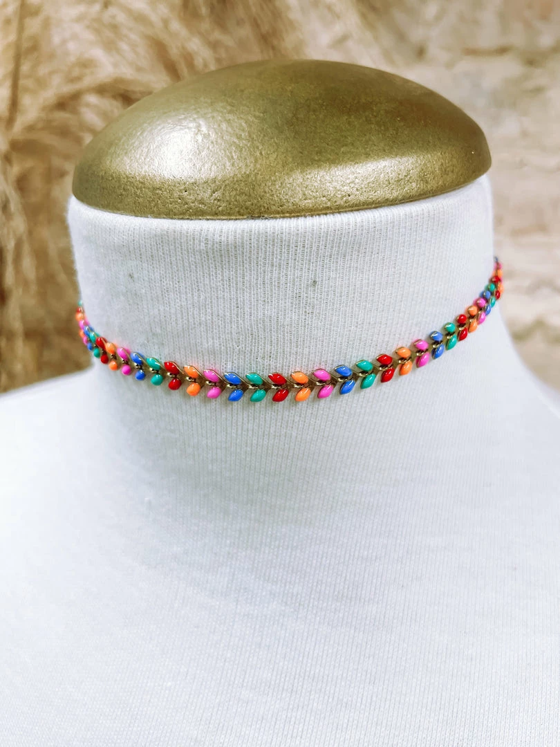 The Color Trail Choker is for the one who adores a pop of color!! Making a statement in gold with red, orange, pink, blue and teal throughout! An excellent gift and treat your self. With an adjustable hook clasp this timeless piece is simply perfection!