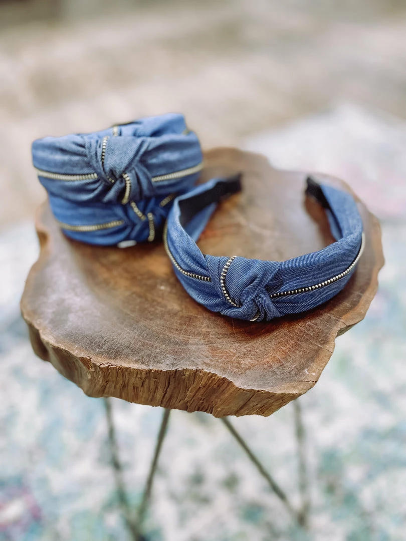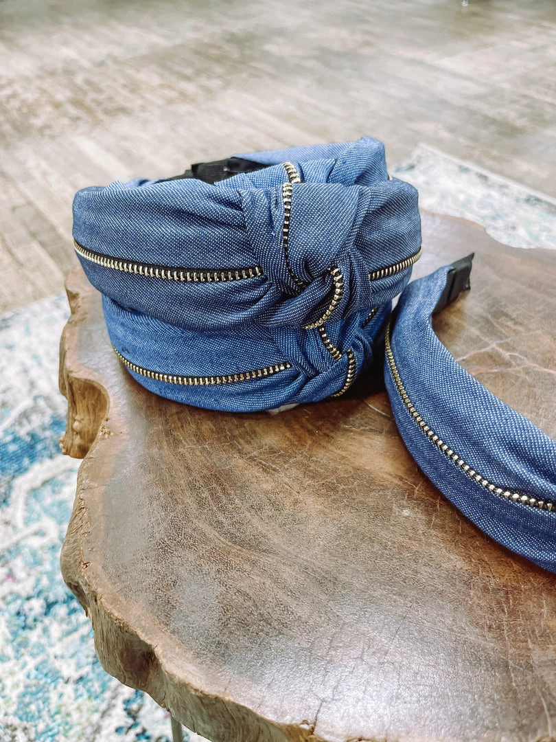 Texas Bling Denim Zipper Mid Knot Headband- Dark Blue