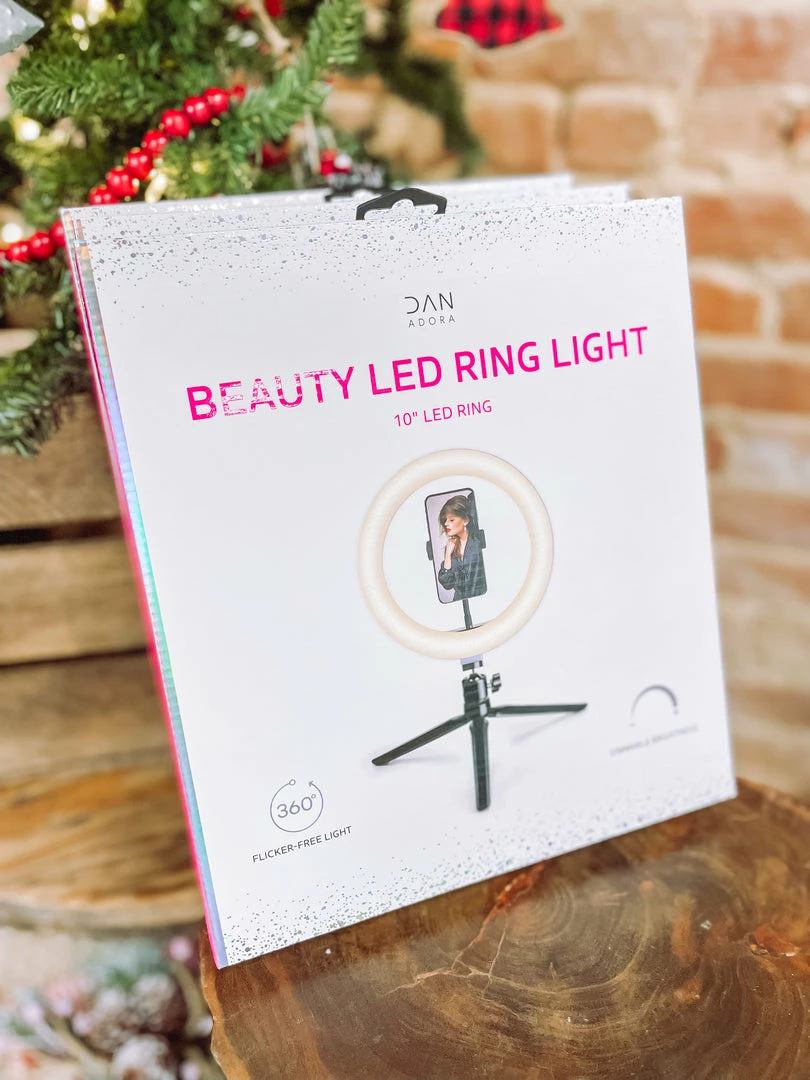 Beauty LED Ring Light with tripod stand & phone holder! This multifunctional stand has a 10 inch ring light for major glow, with three cooler temperatures and dimmable brightness levels which will take care of unwanted shadows and make your features POP to perfection!