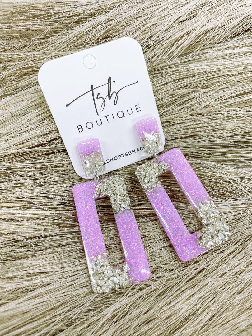 Texas Bling Glitter Open Rectangle Earrings- Lavender & Silver Jewelry