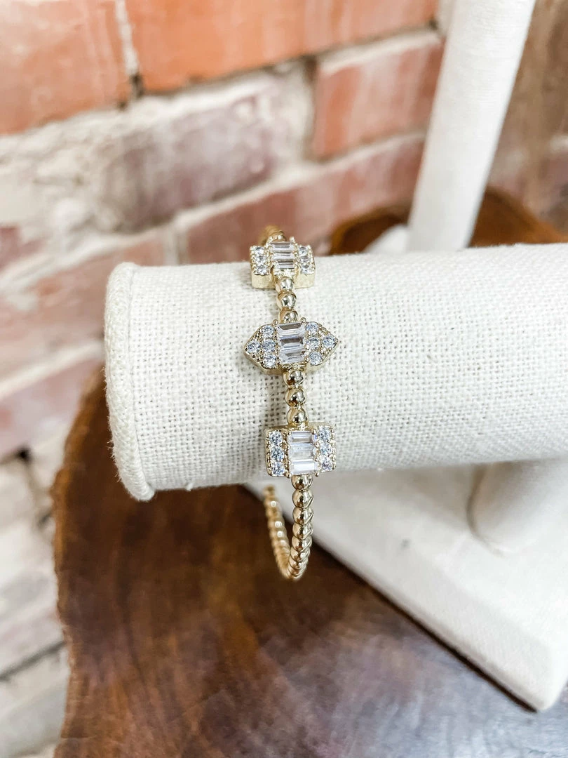 Dainty meets elegance in our Golden Girl Bracelet! Designed with rhinestone detail + gold hardware. This piece is perfect for stacking or to stand alone!