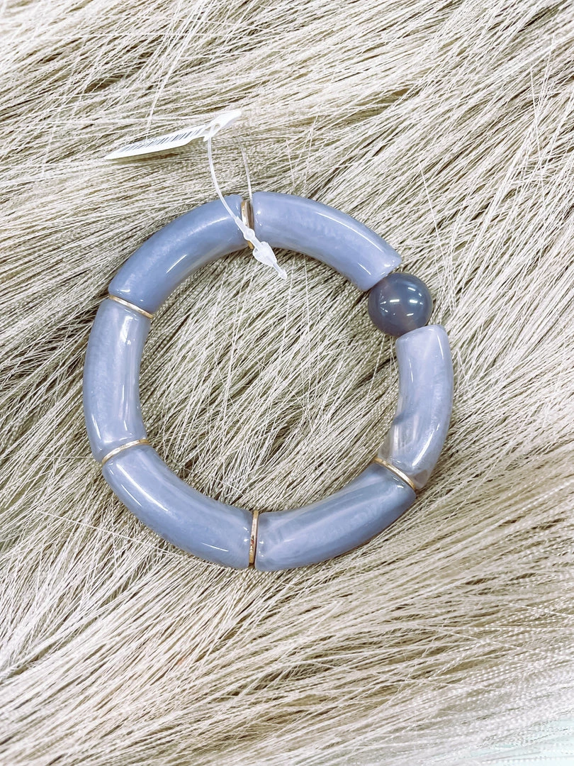This grey acrylic bracelet showcases a neutral accessory with a touch of gold! A new everyday bracelet that will enhance every outfit!