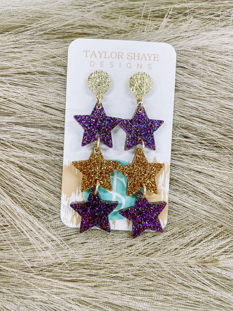 Make a statement with the Millie Earrings! Showcasing sparkly goodness with purple and gold stars!! So extra and fun! An absolute must have for weekend get aways and party festivities!