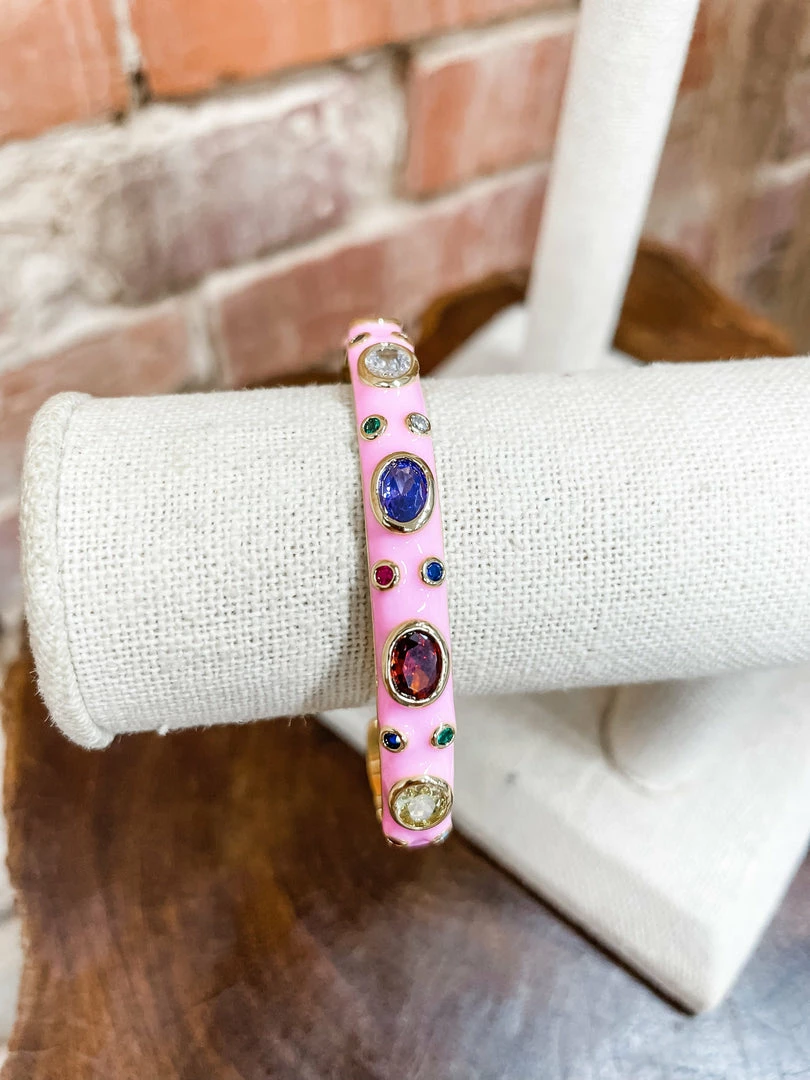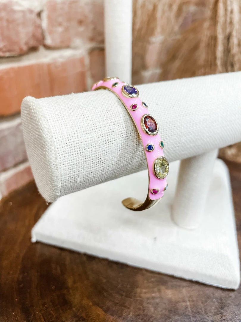 Meet the all new Porsha Bangle! Designed with gold hardware + multi color rhinestones + a beautiful pink enamel. This piece is perfect for everyday wear! Stack it with the other 3 colors available for an eye catching look