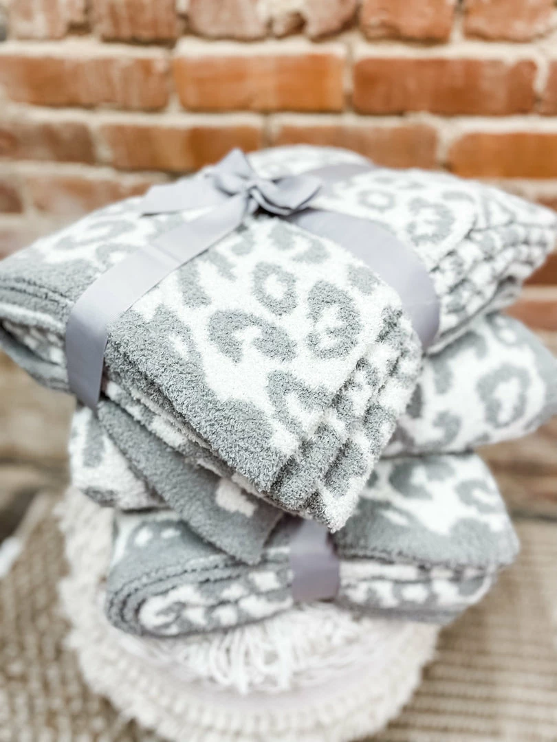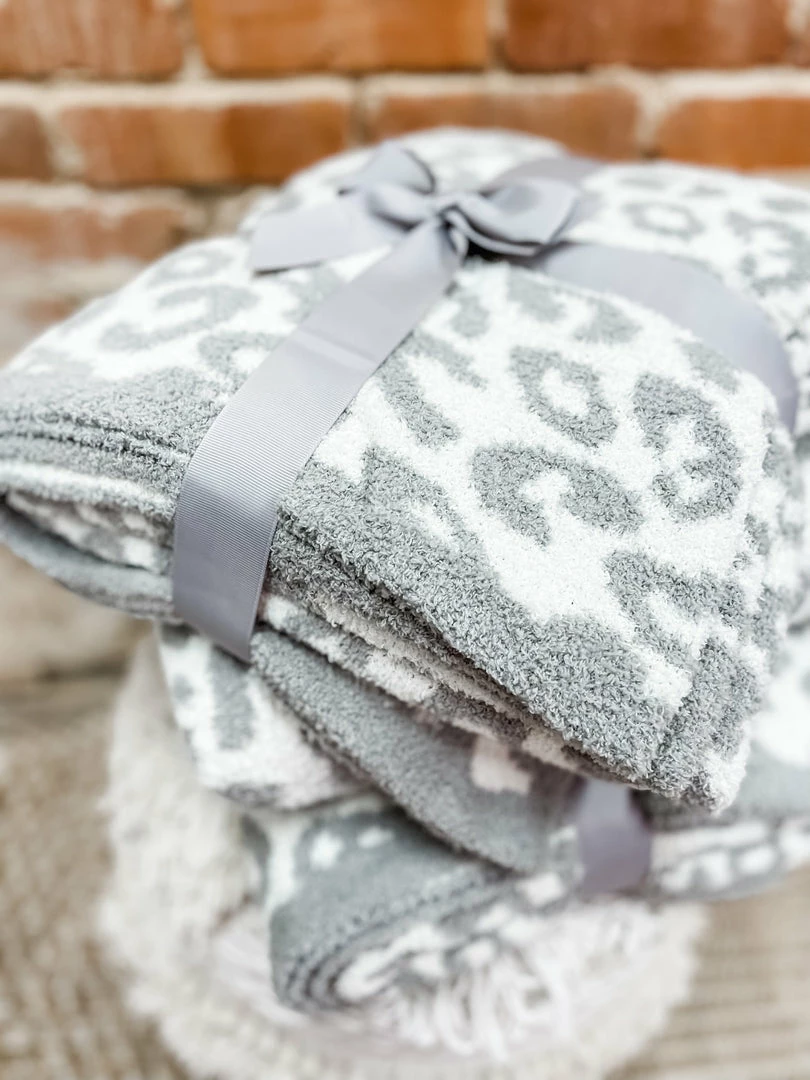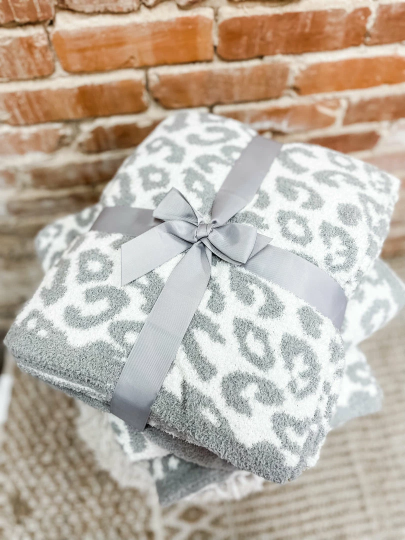 Cozy up in the Joanna Leopard Patterned Blanket! Cool grey leopard spots keep this blanket on the chic side of style for your home!