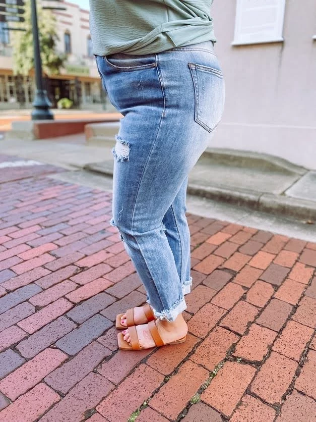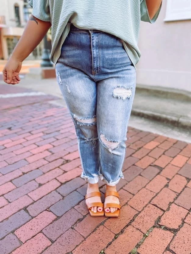 Hey girl hey! We’ve got the edgy denim of the season! This pair is tailored as high waisted, button/zip fly, 5 belts loops, and straight leg fit! All the distressing is the element that seals the deal ~ oh so fab and great for all your spring looks! Styled with our Stevie Top and Ramsey Sandals.