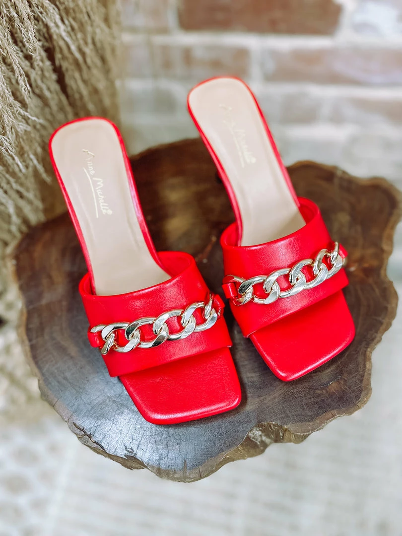 Our Macie Heels are right on trend! Featuring a single strap + gold chain detail + square toe + 3 inch heel! Simply perfect to pair with all your dresses or skinnies and a bodysuit!