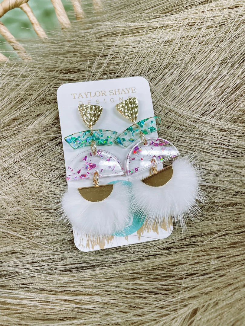 Girl, you are flawless! 😉 The Melani earrings are the absolute cutest with a white puff pom, gold, pink and teal inspired details!