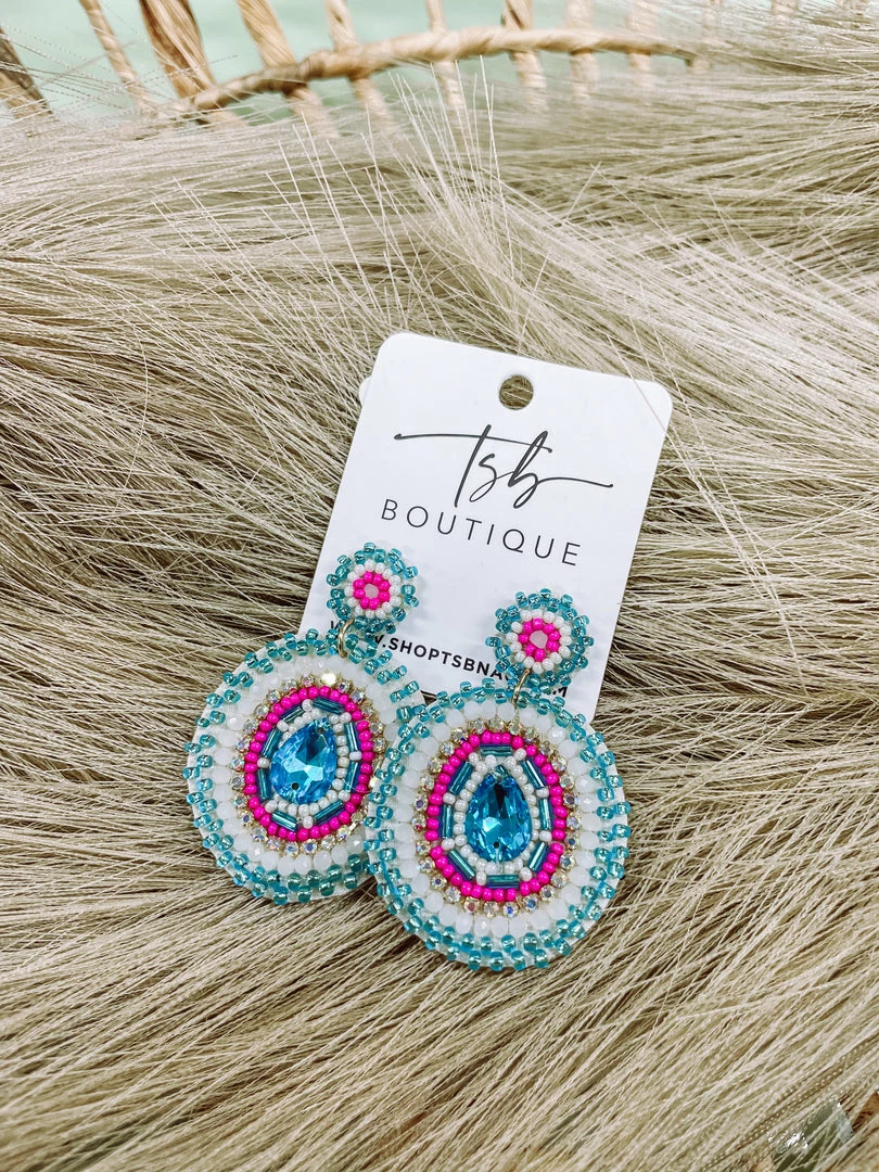 Beaded cuteness! Our Ginny Drop Earrings are the perfect item to complete your vacation outfit! With a soft fabrication on the back side + fairly light weight + blue, pink and white color palette, these earrings will only treat you right!