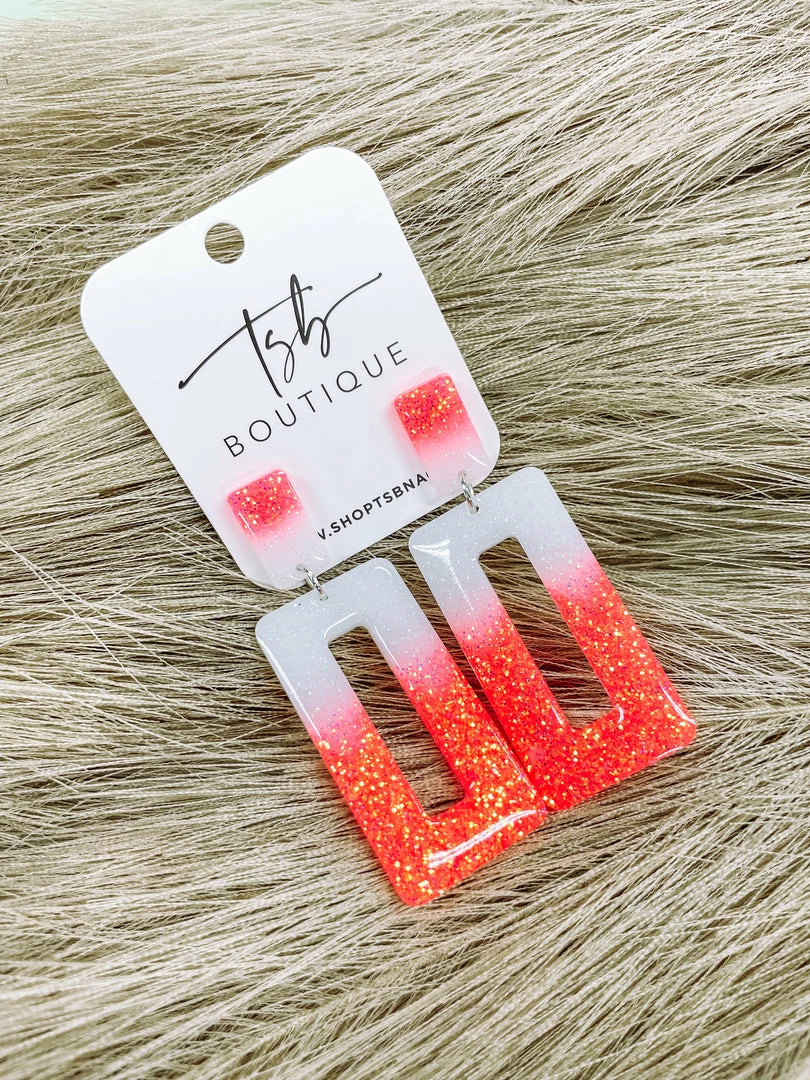 Texas Bling Neon Fit Check Glitter Open Rectangle Earrings- White & Coral Sunrise