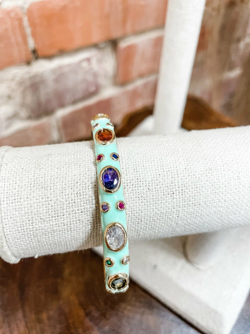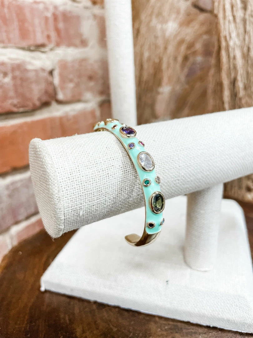 Meet the all new Porsha Bangle! Designed with gold hardware + multi color rhinestones + a beautiful mint enamel. This piece is perfect for everyday wear! Stack it with the other 3 colors available for an eye catching look